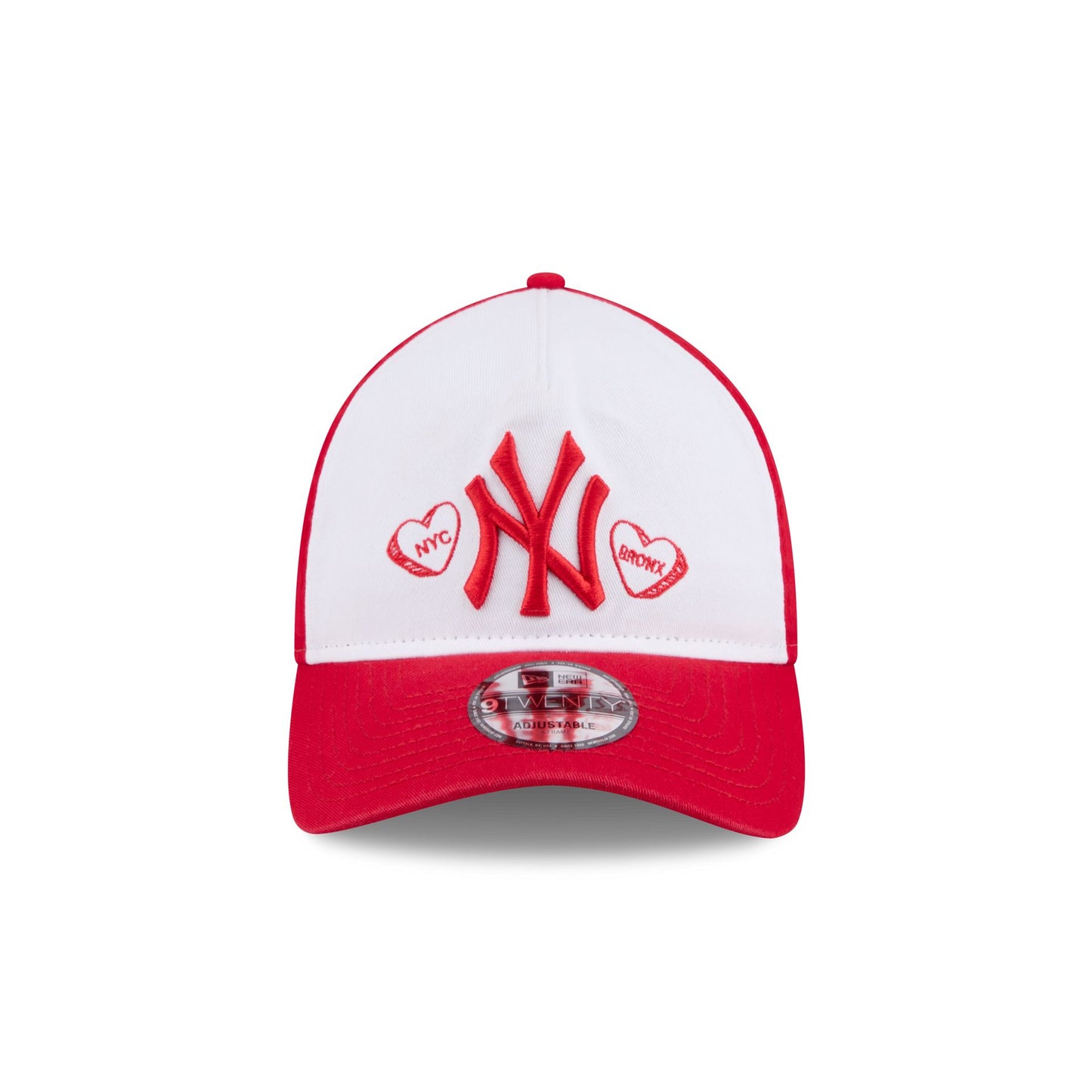 The New York Yankees Conversation Hearts 9TWENTY A-Frame Adjustable Cap features an embroidered Yankees logo with conversation hearts at the front panels. Additional details include an adjustable D-Ring closure at the rear and a pink undervisor.