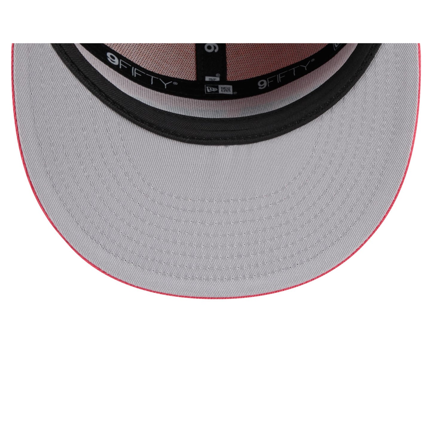 The New York Yankees Coral 9FIFTY Split Panel Snapback features an embroidered Yankees wordmark at the front panels with a snapback closure at the rear, a multicolored crown, and a gray undervisor.