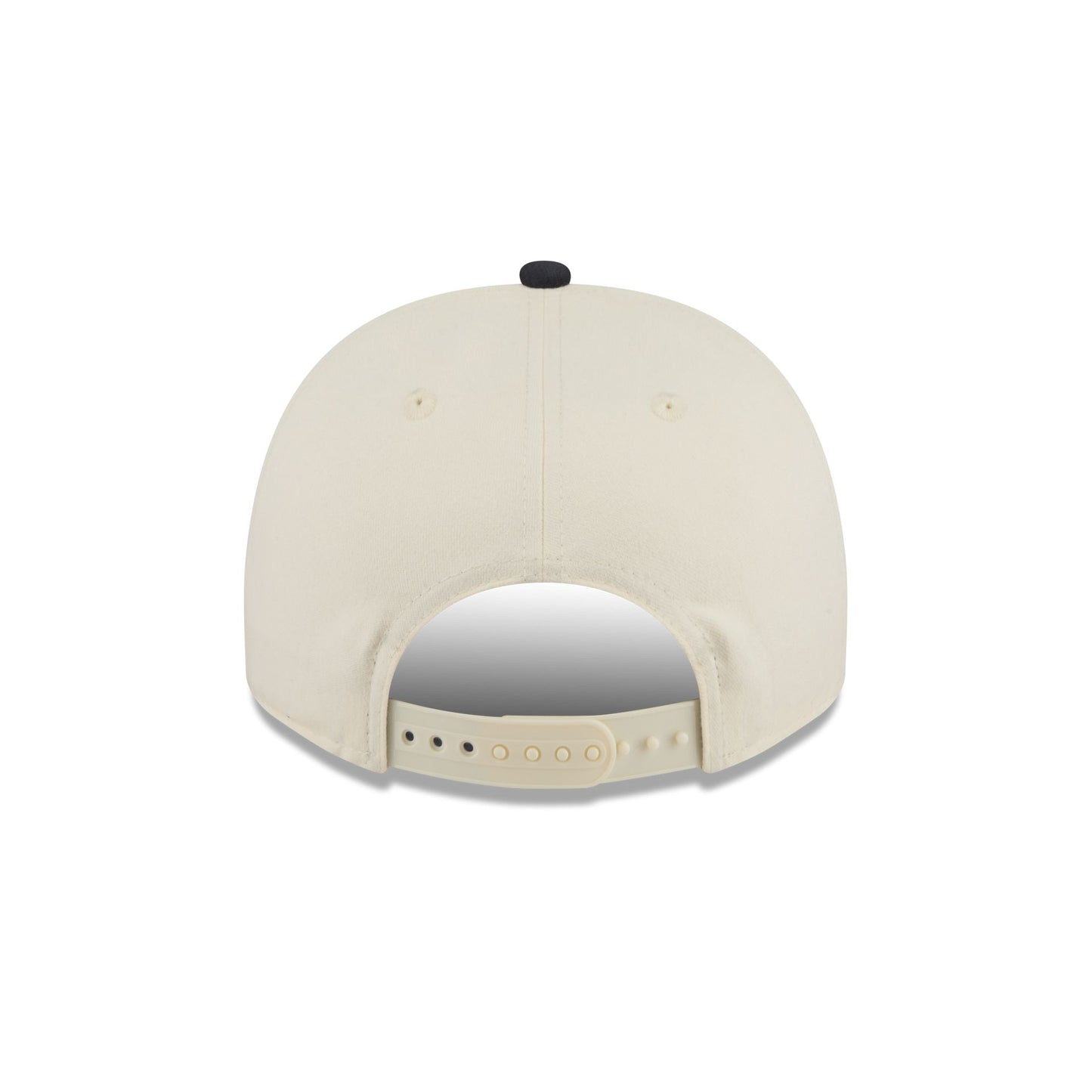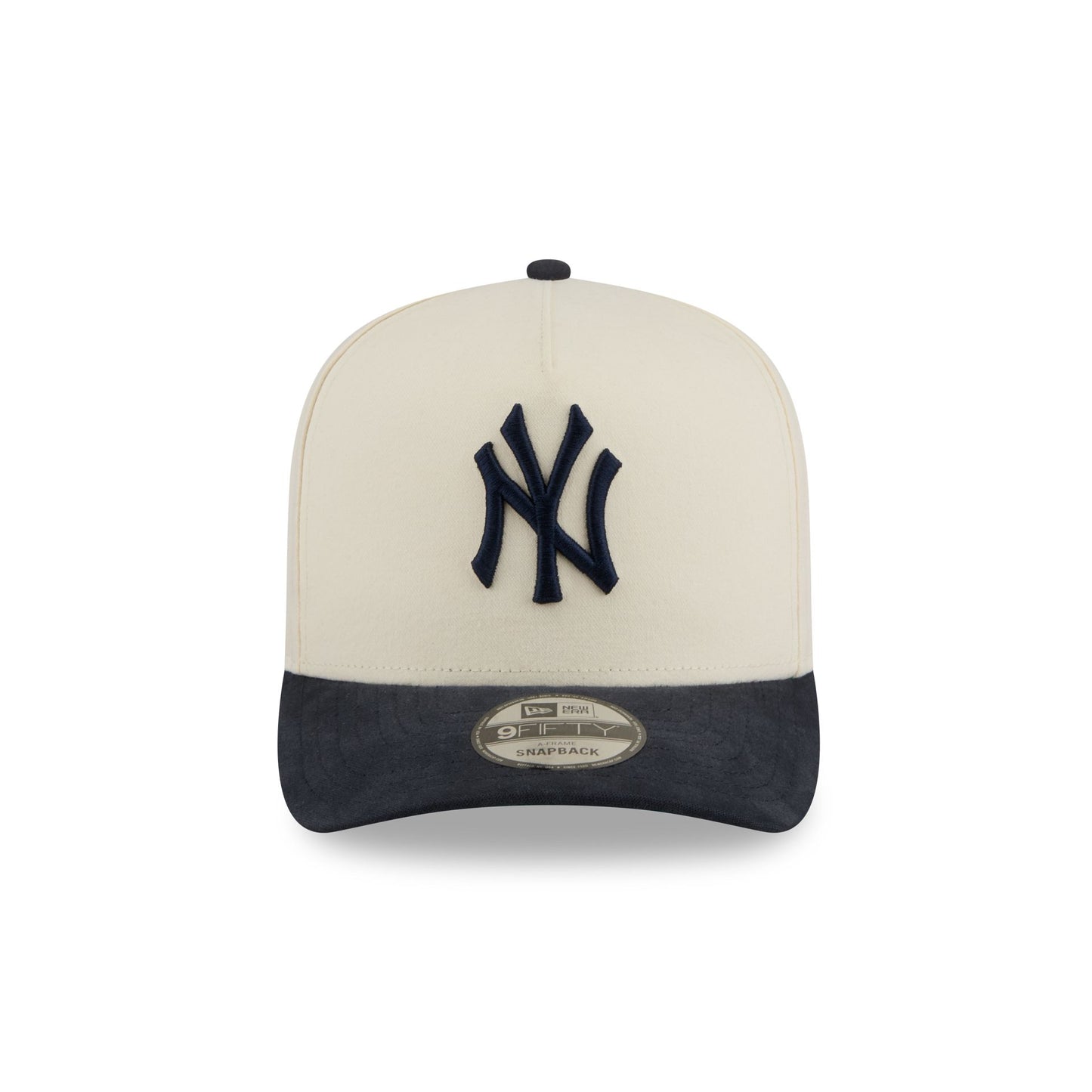 The New York Yankees Cotton Brush Chrome Pre-Curve 9FIFTY A-Frame Snapback features an embroidered Yankees logo at the front panel with an adjustable snapback closure at the rear. Additional details include a team wordmark at the right-wear side with a matching team color visor and a green undervisor.