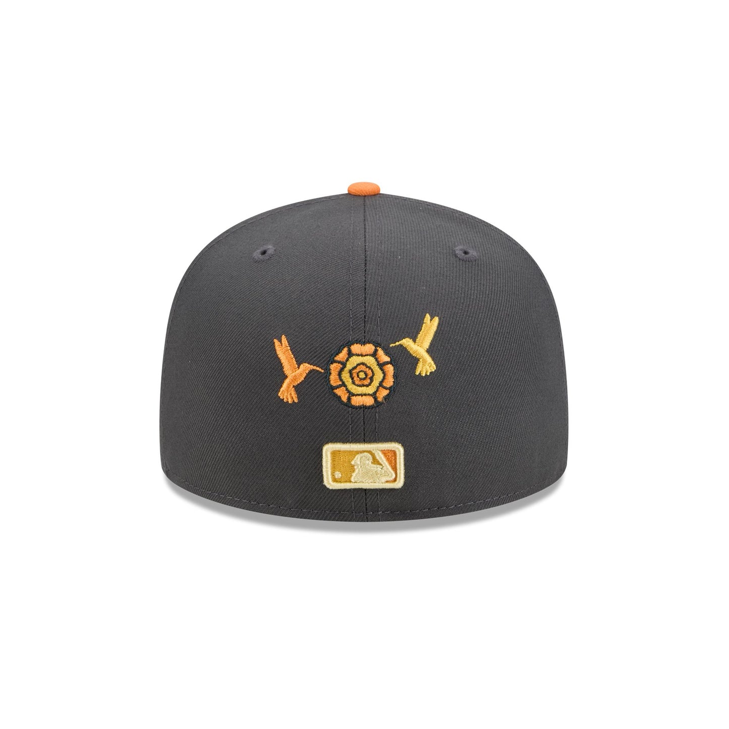 The New York Yankees Day of the Dead Graphite 59FIFTY Fitted Cap features an embroidered Yankees logo at the front panels with marigold (cempasúchil) and hummingbird designs throughout, representing the Legend of Xóchitl and Huitzilin. Additional details include a team patch at the right-wear side and a matching MLB Batterman logo at the rear.