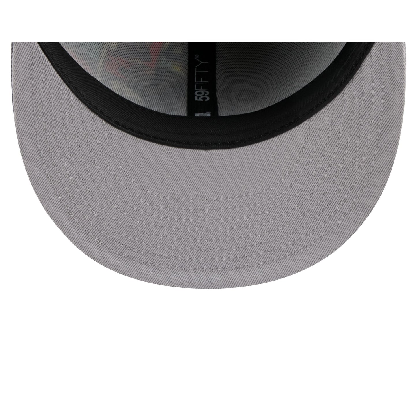 The New York Yankees Diamond Hero Edition 59FIFTY Fitted Cap features an embroidered Yankees onomatopoeia pop logo at the front panels with baseball comic book prints at the front and back panel. Additional details include the MLB Batterman logo at the rear and a gray undervisor.