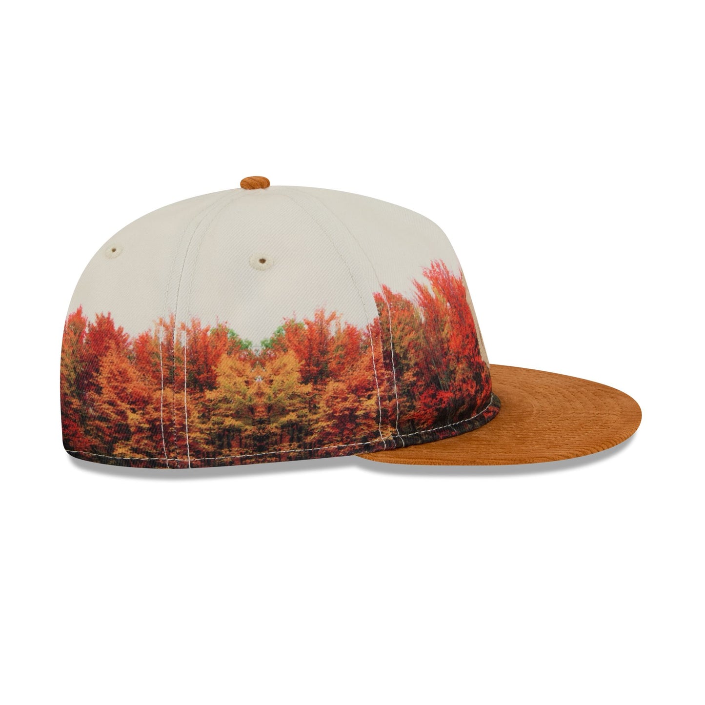The New York Yankees Fall Forest Retro Crown 9FIFTY Adjustable Cap features an embroidered Yankees wool yarn logo at the front panels against an image of a fall forest throughout the cap. Additional details include a corduroy visor and an adjustable buckle closure at the rear.
