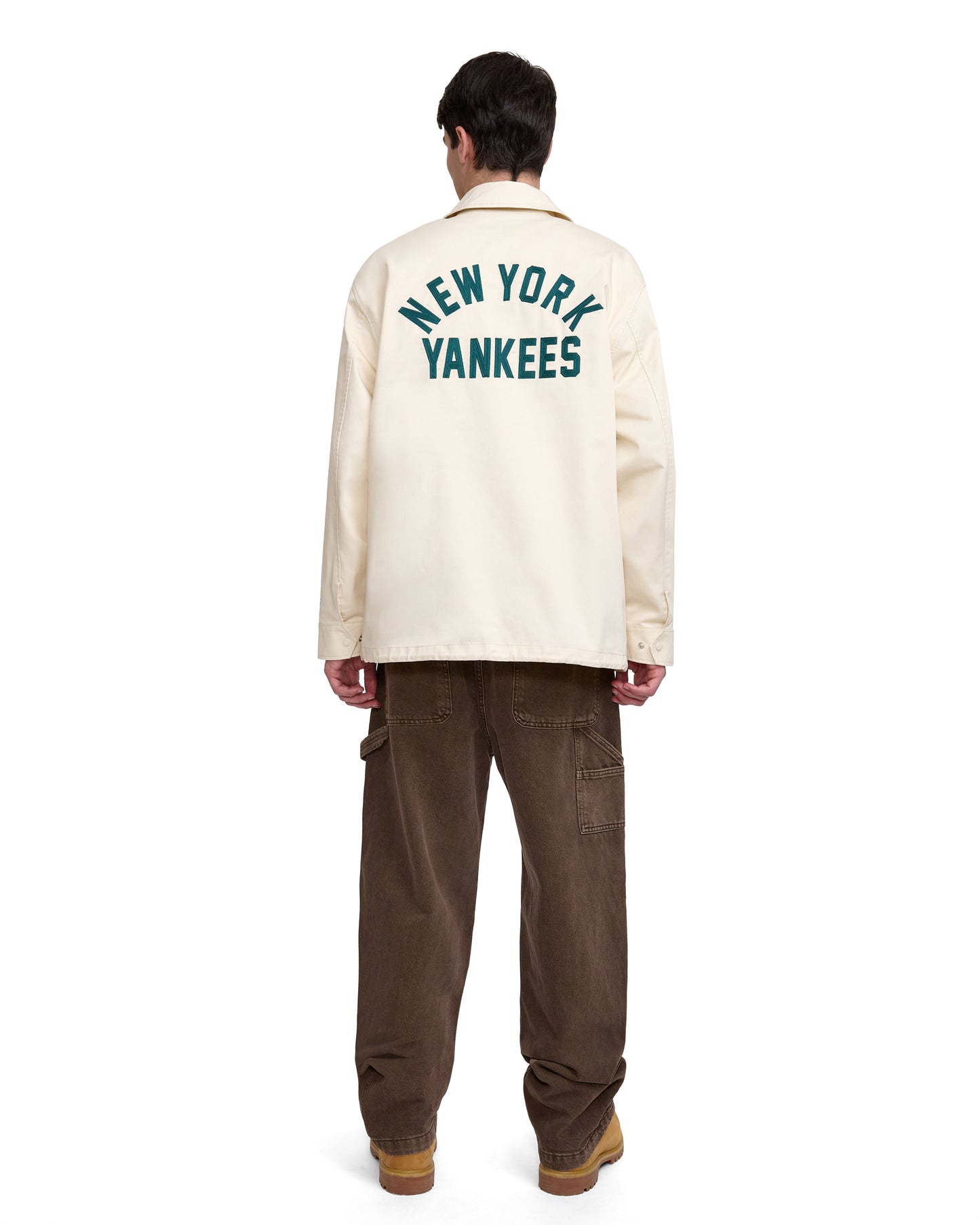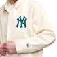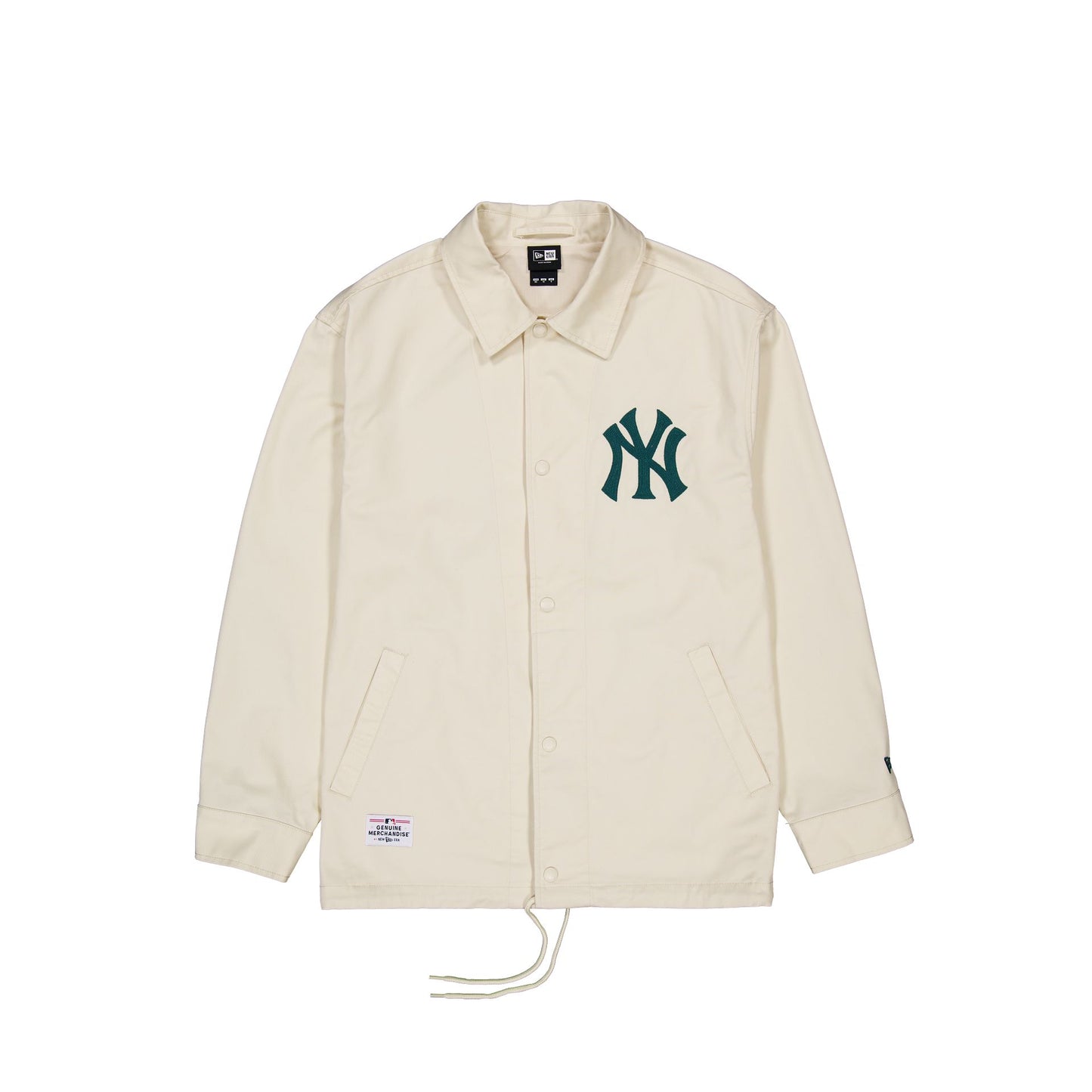 The New York Yankees Ivory Coach Jacket features an embroidered applique Yankees logo at the left chest and a team wordmark at the rear. Additional details include a snap button closure and an adjustable drawstring at the waist.