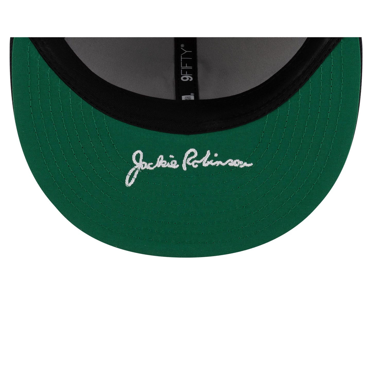 The New York Yankees Jackie Robinson Day 2025 Retro Crown 9FIFTY Snapback features an embroidered Yankees logo at the front panels with an MLB Batterman logo above a snapback closure at the rear. Additional details include a Jackie Robinson pin at the left panel and Robinson's embroidered signature on a green undervisor.