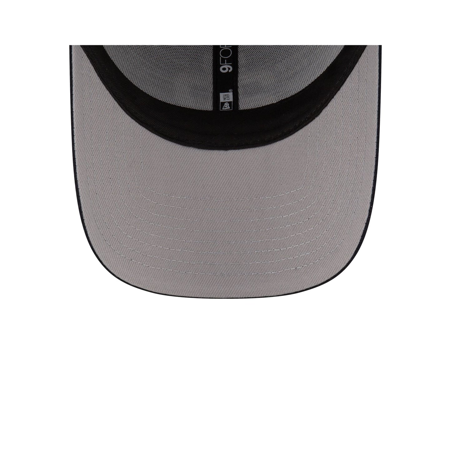 The New York Yankees Juan Soto 22 9FORTY Adjustable Cap features the player's name and number at the front panels with a Yankees logo embroidered at the right-wear side, a gray undervisor, and an adjustable hook and loop strap at the rear.
