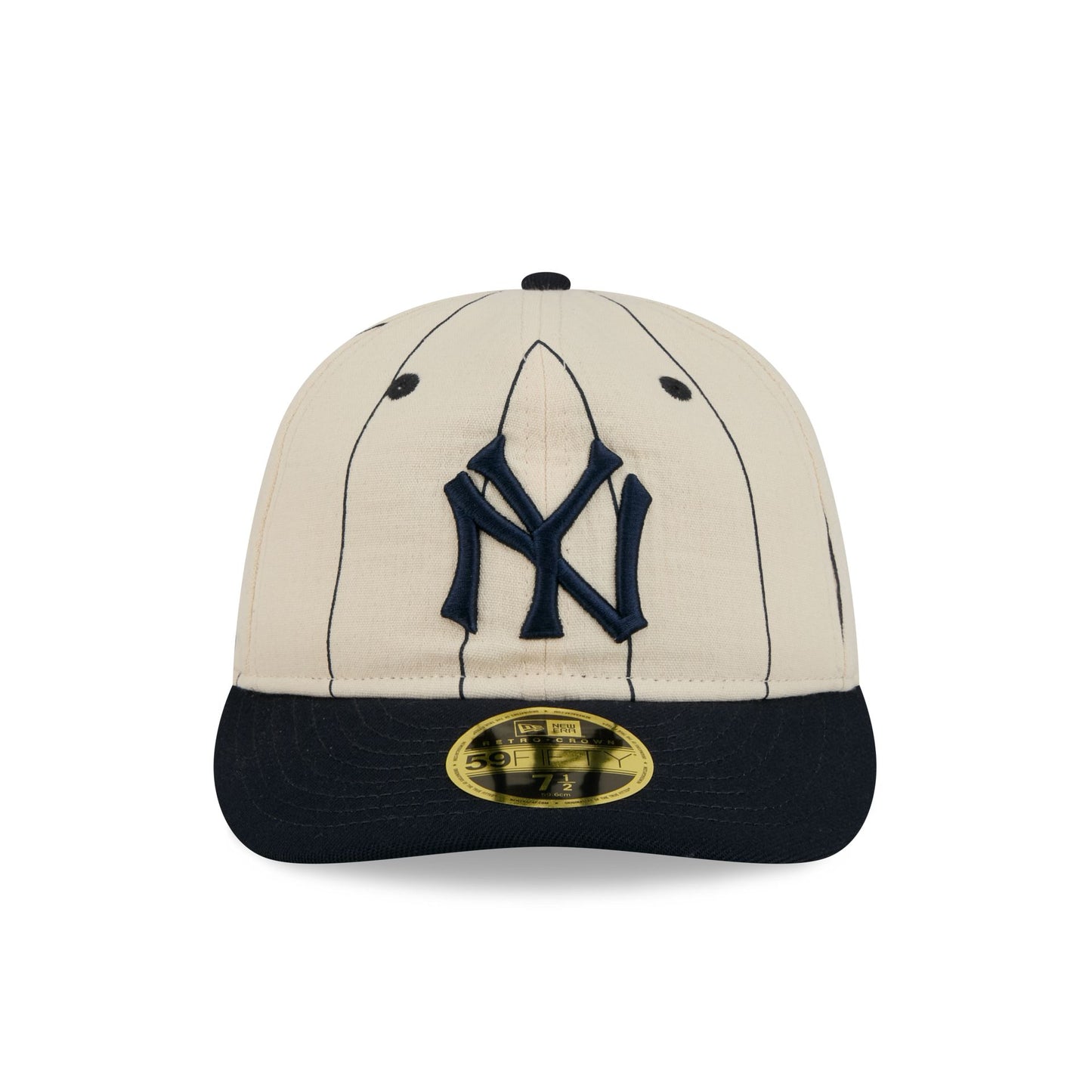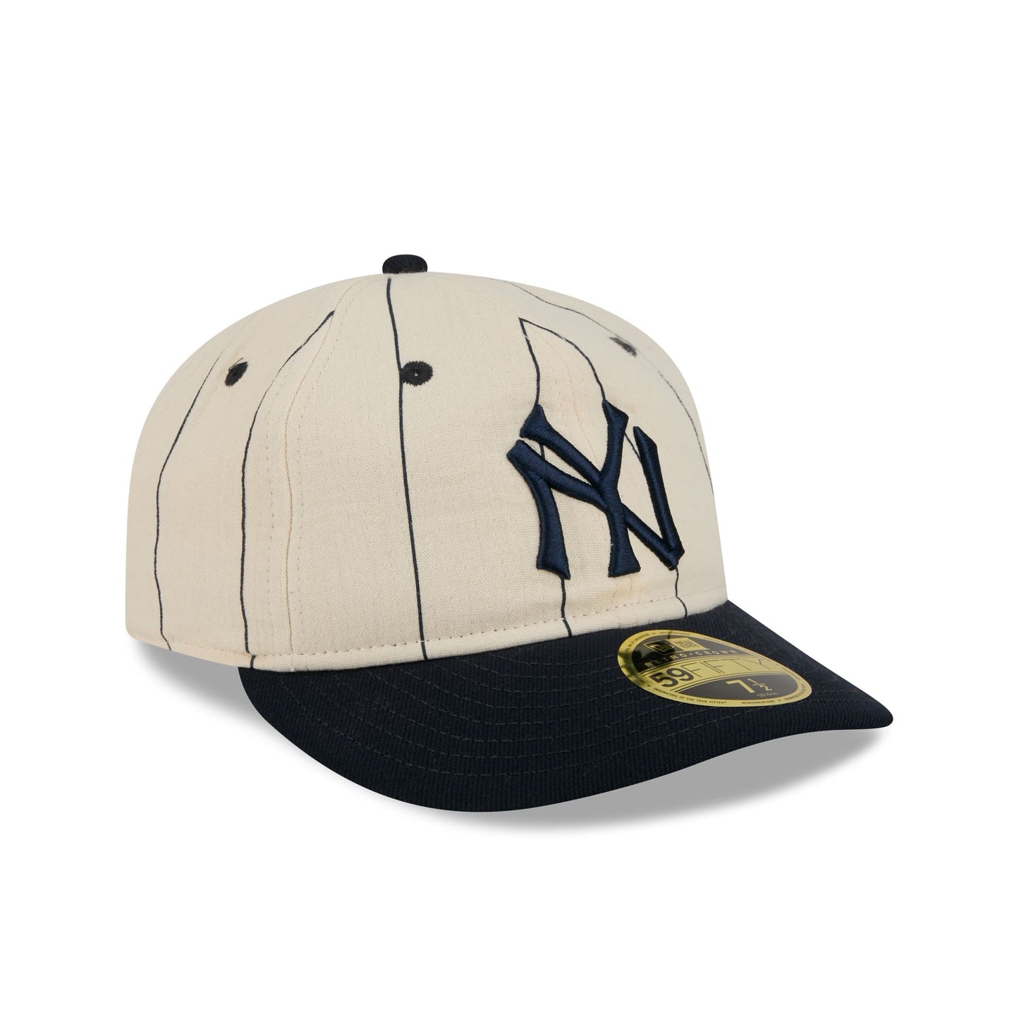 The New York Yankees Linen Pinstripe Retro Crown 59FIFTY Fitted Cap features an embroidered Yankees Cooperstown logo at the front panels against a linen pinstripe fabrication throughout. Additional details include the MLB Batterman logo at the rear and a green undervisor.