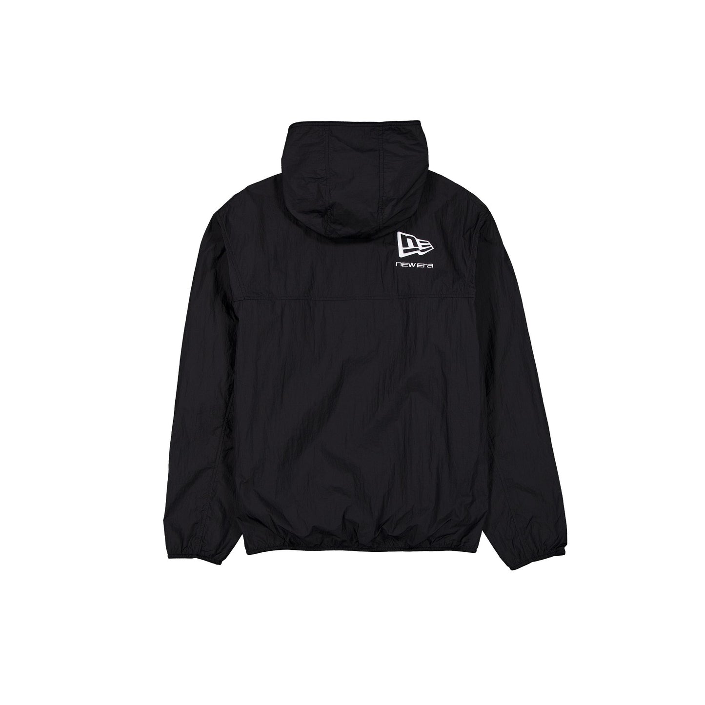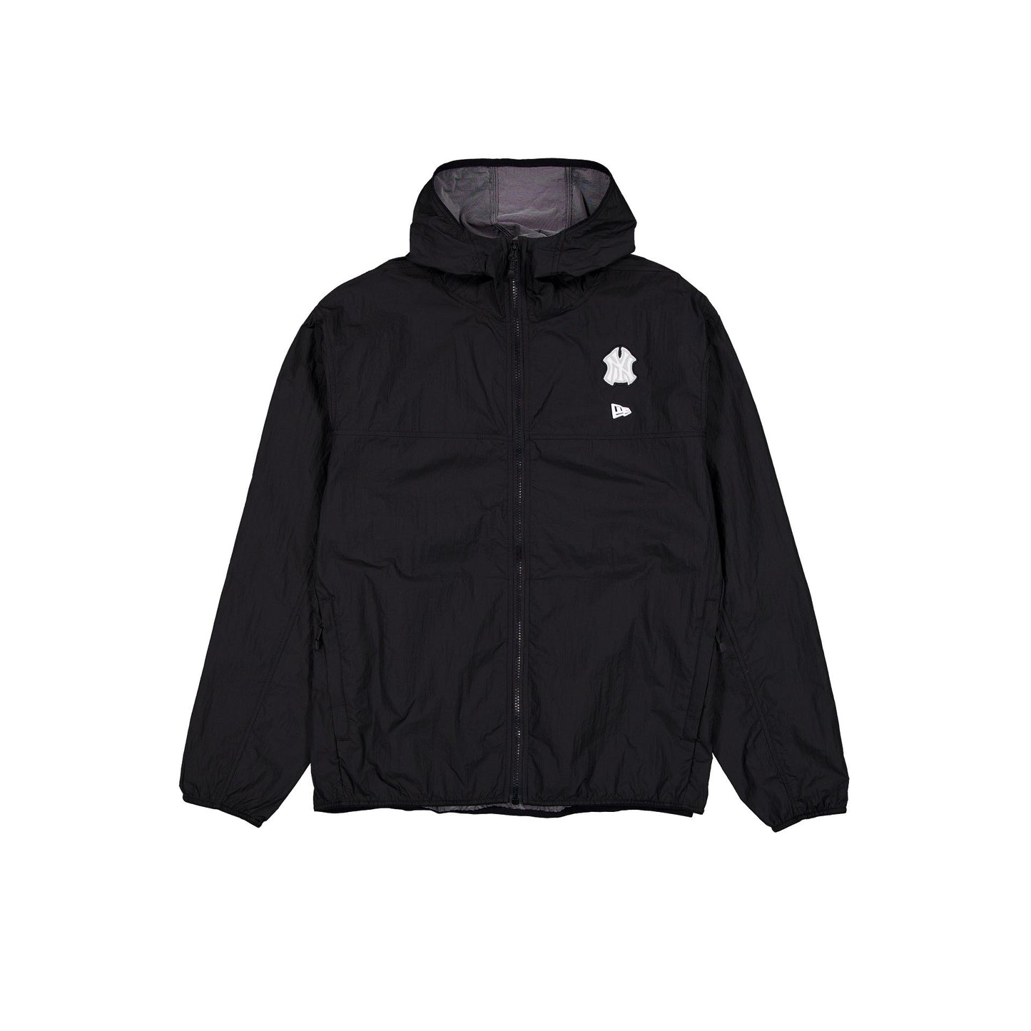 The New York Yankees Logo Essentials Black Full-Zip Windbreaker features a silicone Yankees logo at the left chest with a New Era flag below and at the rear. Additional details include a full-zip closure and front pockets.