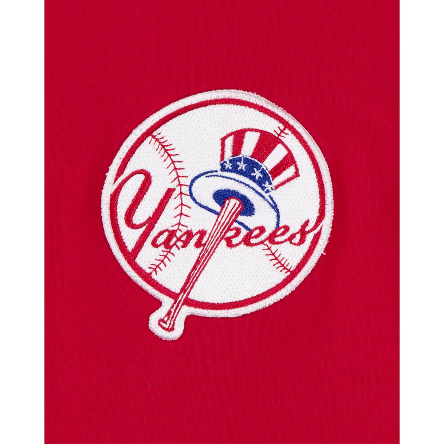 The New York Yankees Logo Select Color Flip Red Hoodie features a chenille applique Yankees logo at the left chest with team patches at each sleeve and an embroidered team script at the hood.