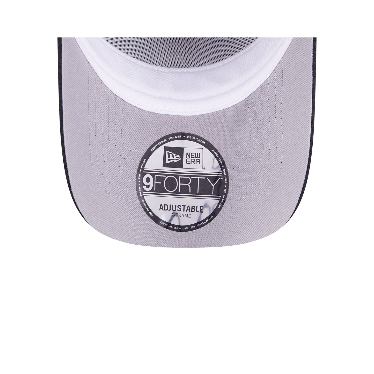The New York Yankees Ornate Visor 9FORTY A-Frame Snapback features an embroidered Yankees logo at the front panel with a gold ornate embroidered trim at the visor, a gray undervisor, and a snapback closure at the rear.