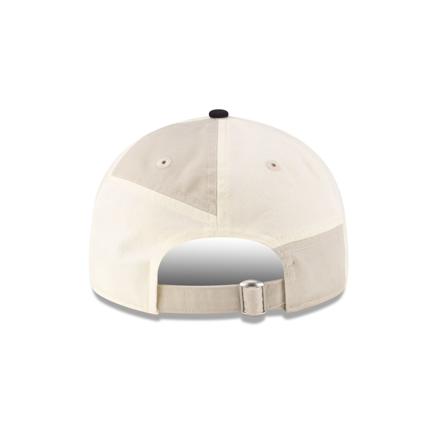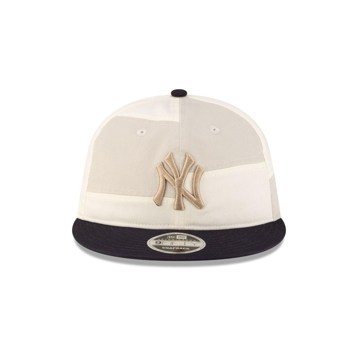 The New York Yankees Patchwork Retro Crown 9FIFTY Adjustable Yankees logo at the front panels with an adjustable D-Ring closure at the rear, beige and cream patchwork throughout the crown, and a navy visor.