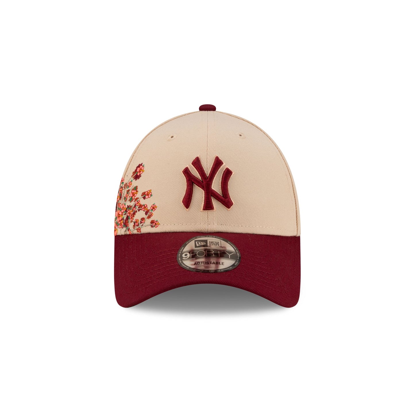 The New York Yankees Puerto Rico City Elements 9FORTY Snapback features an embroidered Yankees logo at the front panels with the national flower of Puerto Rico, the Flor de Maga (Thespesia grandiflora), embroidered at the right-wear side. Additional details include an adjustable snapback closure at the rear and a green undervisor.