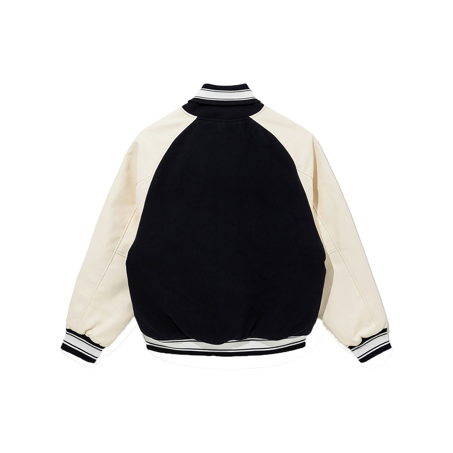 The New York Yankees Raglan Navy Varsity Jacket features an embroidered New Era Cap wordmark at the right chest with a chainstitched applique Yankees logo at the left chest, a snap-button closure at the front, and a team script at the side slit pockets. Additional details include shoulderless raglan design with striped details at the banding on the sleeves and hem, a shawl-style collar, an interior pocket at the left chest, and a quilted insolation lining.