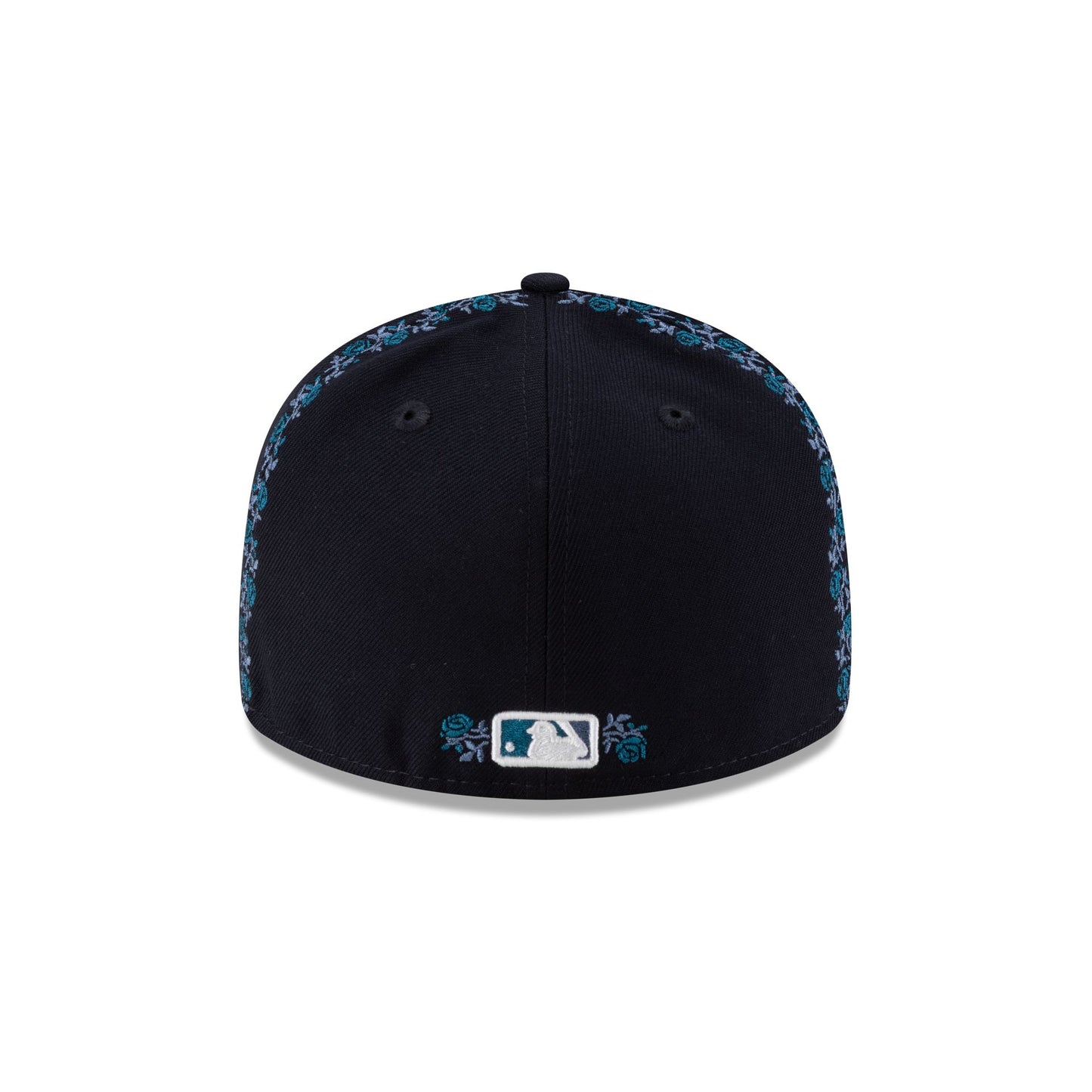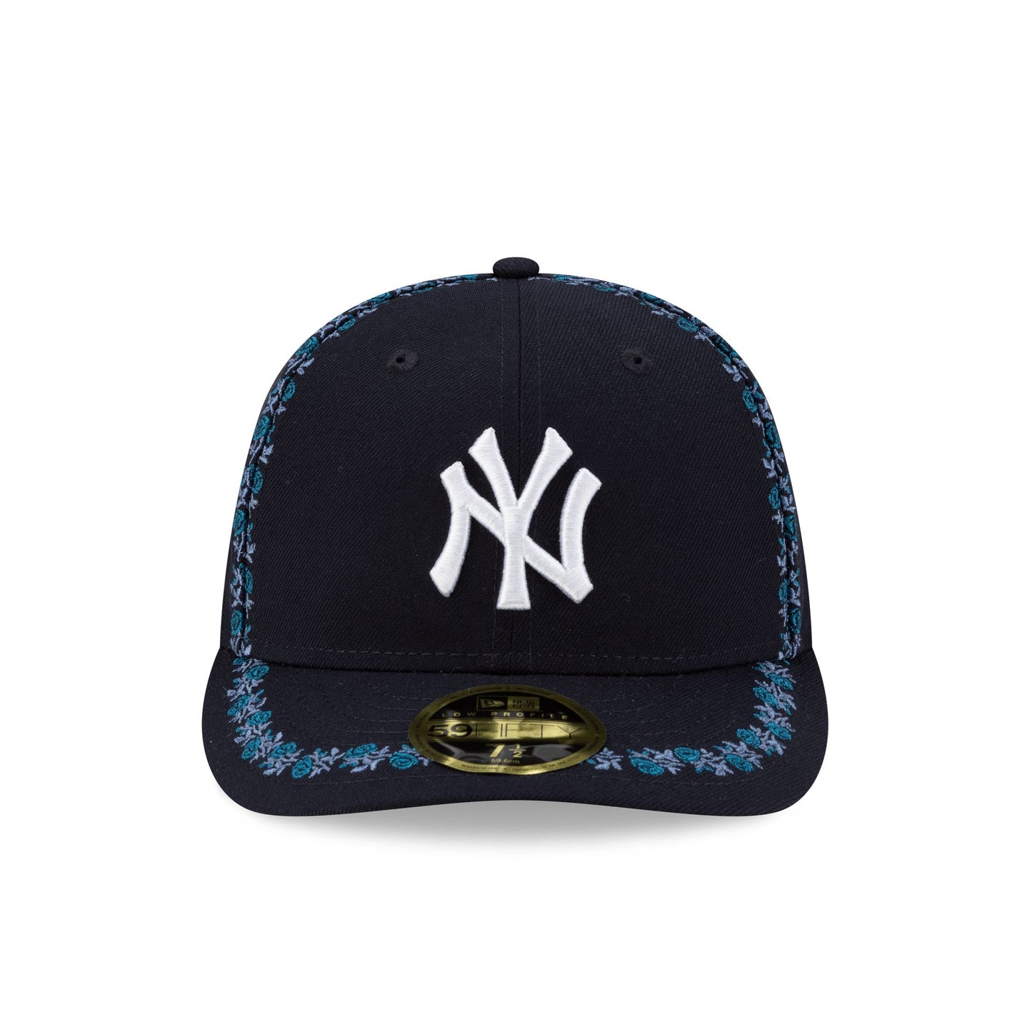 The New York Yankees Rose Emblem Low Profile 59FIFTY Fitted Cap features an embroidered Yankees rose logo at the front panels with the MLB Batterman logo at the rear.