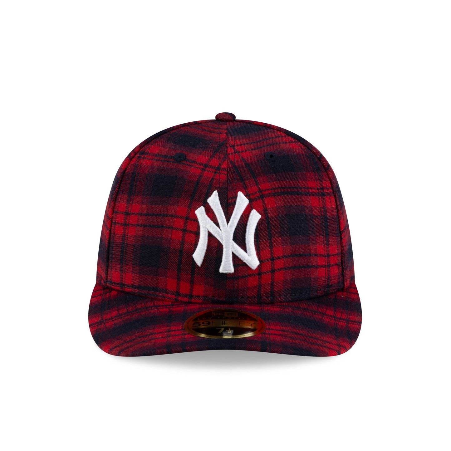 The New York Yankees Scarlet Check Low Profile 59FIFTY Fitted Cap features an embroidered Yankees logo at the front panels with a plaid pattern fabrication throughout and a matching MLB Batterman logo at the rear.
