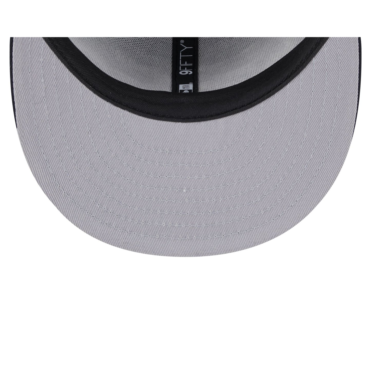 The New York Yankees Kids 9FIFTY Snapback Hat features an embroidered Yankees wordmark at the front panels with a matching team logo at the right-wear side. Additional details include a gray undervisor and a snapback closure at the rear.
