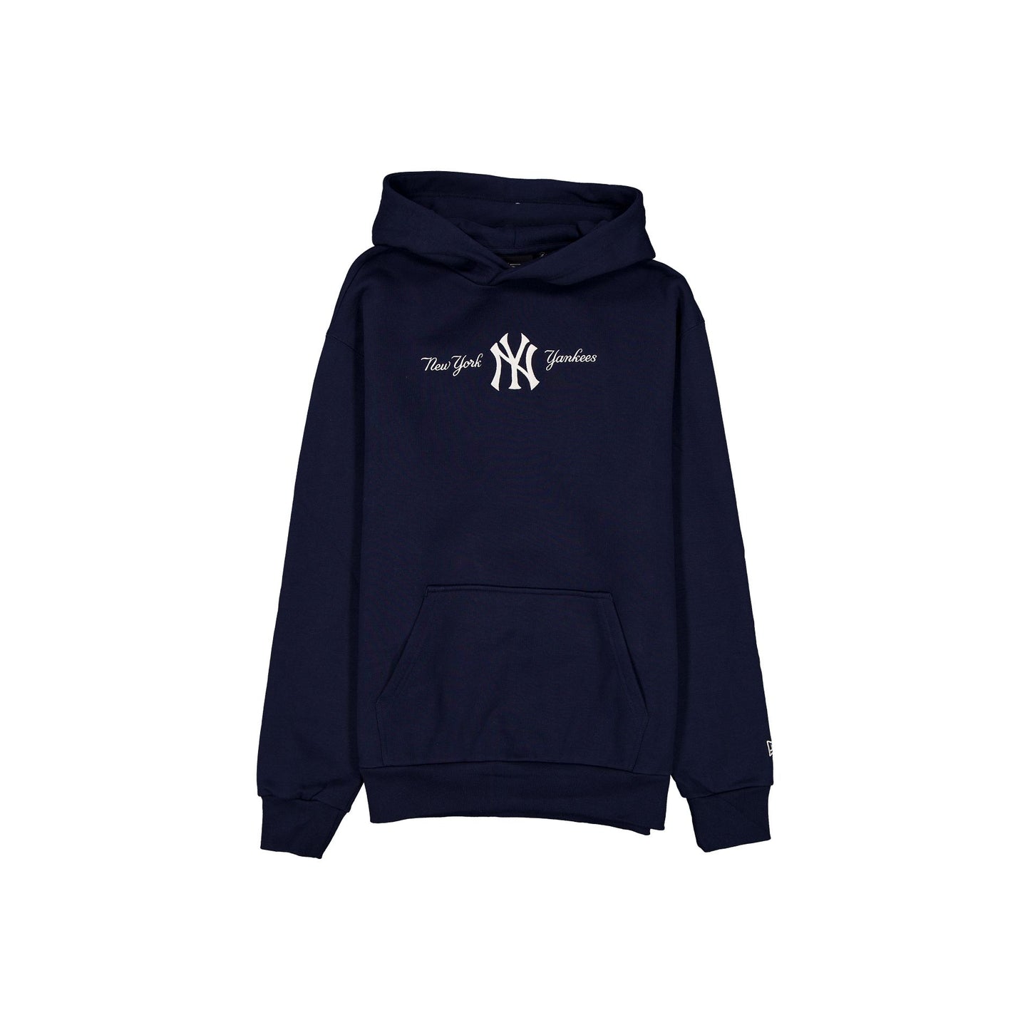 The New York Yankees Script Navy Hoodie features an embroidered Yankees logo and script wordmark at the front with kangaroo pockets and a hood.