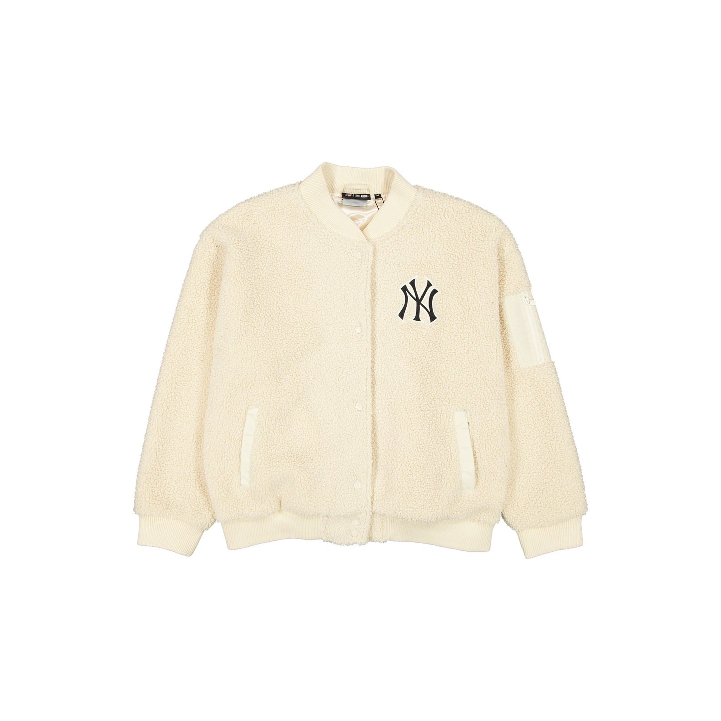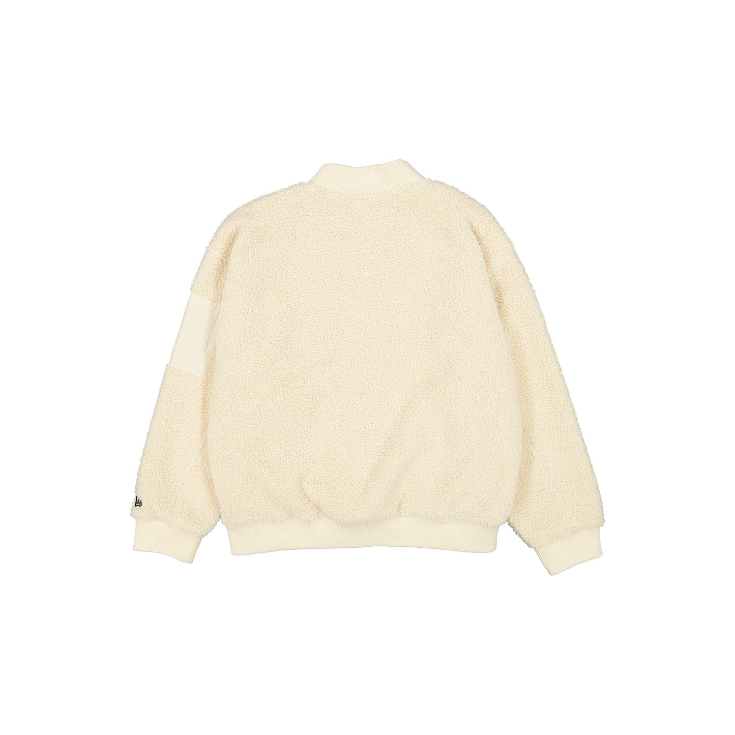 The New York Yankees Sherpa Light Beige Women's Bomber Jacket features an embroidered Yankees logo at the left chest with a snap button closure at the front and a New Era Flag at the left wrist.