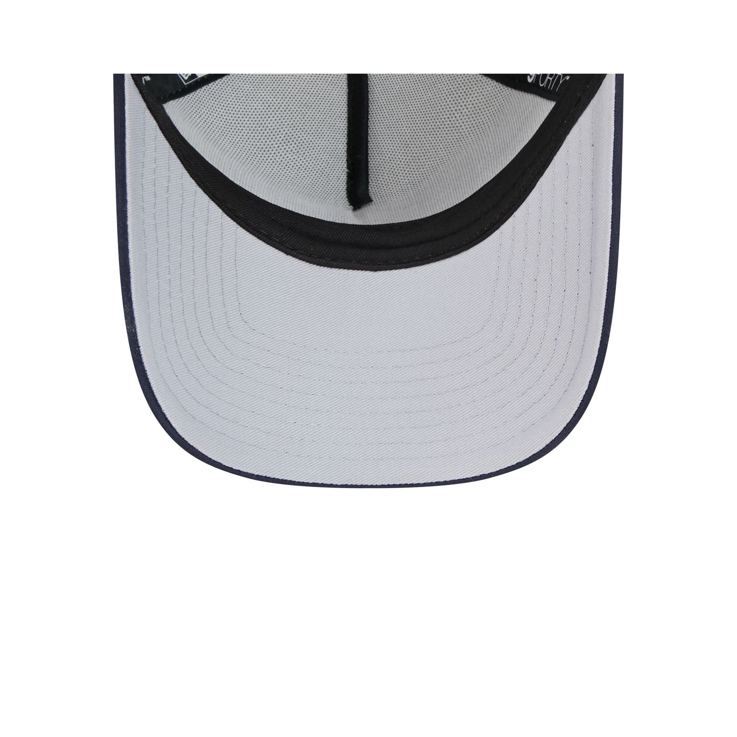 The New York Yankees Sport Classics 9FORTY A-Frame Trucker features a retro screen-printed Yankees wordmark at the front panels with a team logo at the left and an MLB Batterman logo at the right. Additional details include a mesh back, a gray undervisor, and a snapback closure at the rear.
