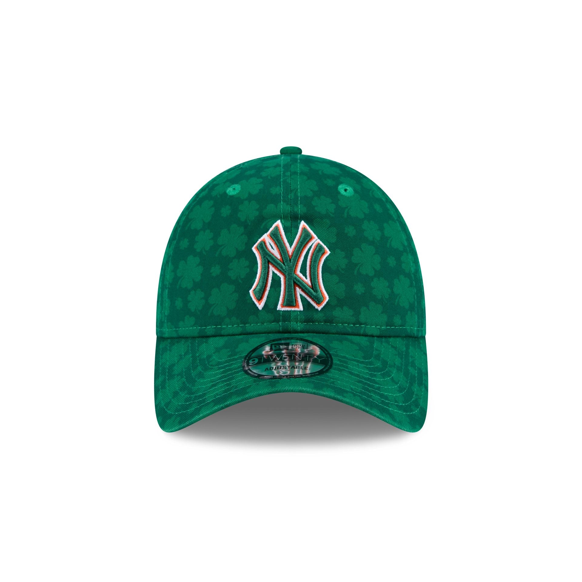 The New York Yankees St. Patrick's Day 2025 9TWENTY Adjustable Cap features an embroidered Yankees logo at the front panels with a four-leaf clover pattern throughout the cap, a D-Ring closure at the rear, and a gray undervisor.