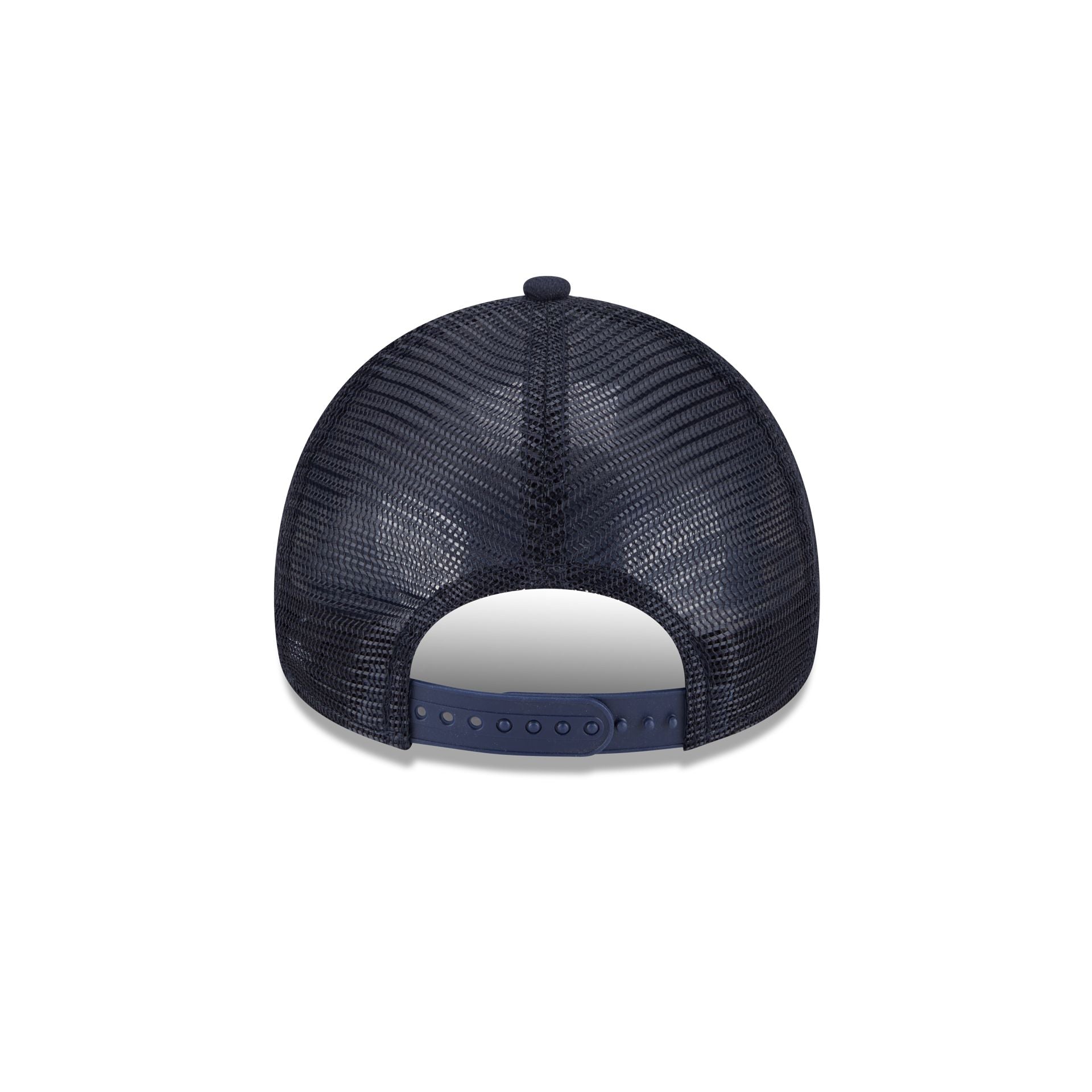 The New York Yankees State Stitch 9FORTY A-Frame Trucker features an embroidered Yankees logo and state stitch design at the front panels with a Trucker closure at a mesh rear and a gray undervisor.