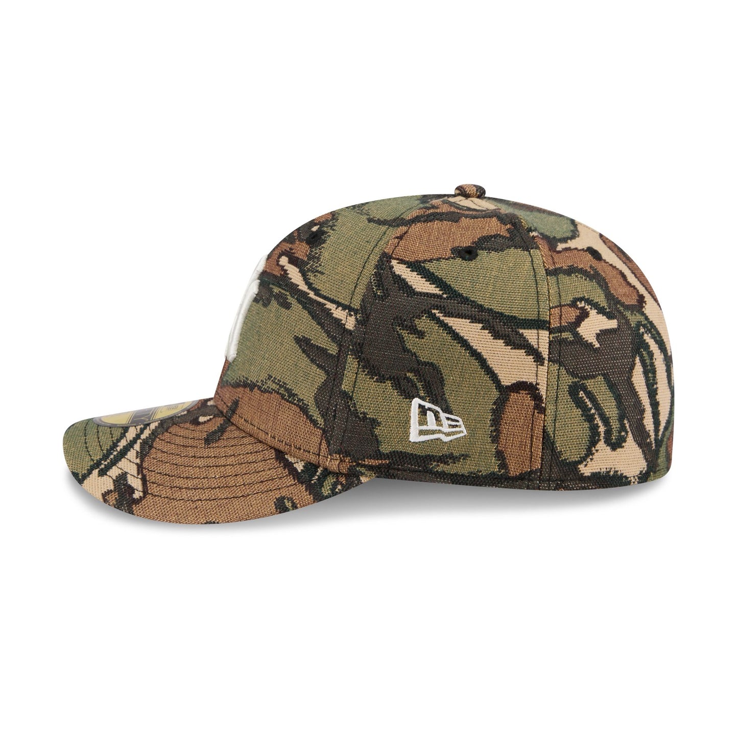 The New York Yankees Three Looms Jacquard Camo Pre-Curved 59FIFTY Fitted Cap features an embroidered Yankees logo at the front panels with a matching MLB Batterman logo at the rear and a gray undervisor.