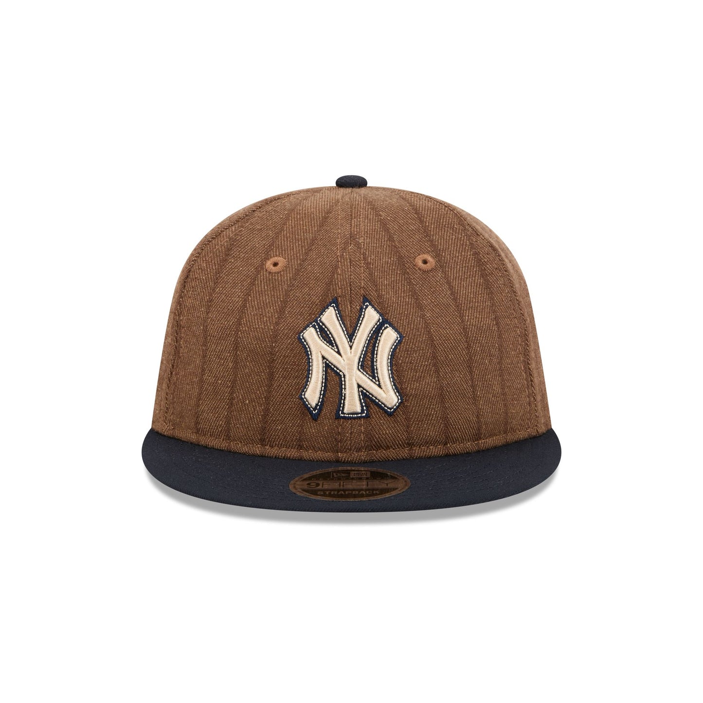 The New York Yankees Three Looms Wool Pinstripe Retro Crown 9FIFTY Adjustable Cap features an embroidered Yankees logo at the front panels with a matching MLB Batterman logo at the right-wear side, a green undervisor, and an adjustable buckle closure at the rear.