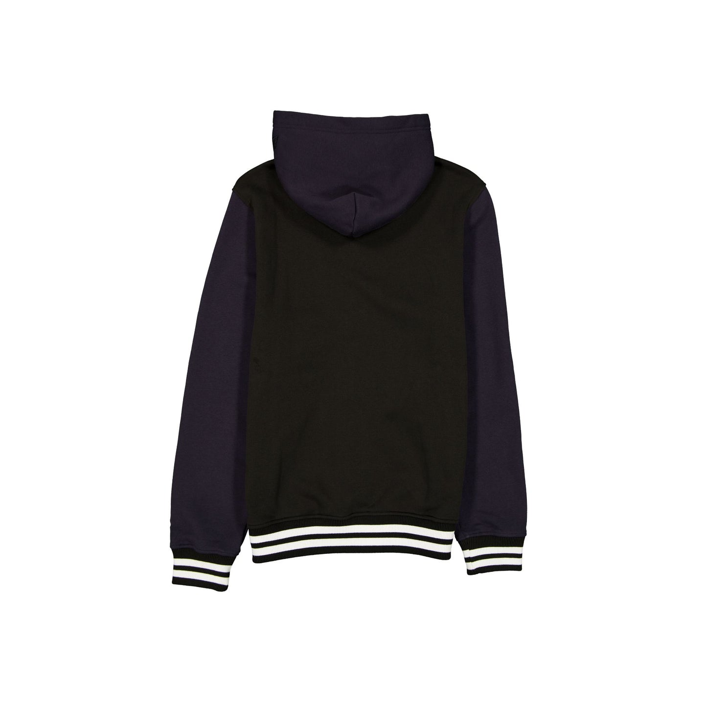 The New York Yankees Throwback Black Jacket features an embroidered chenille applique Yankees logo at the left chest with team patches at the front. Additional details include a snap button closure, pockets, and a hood.