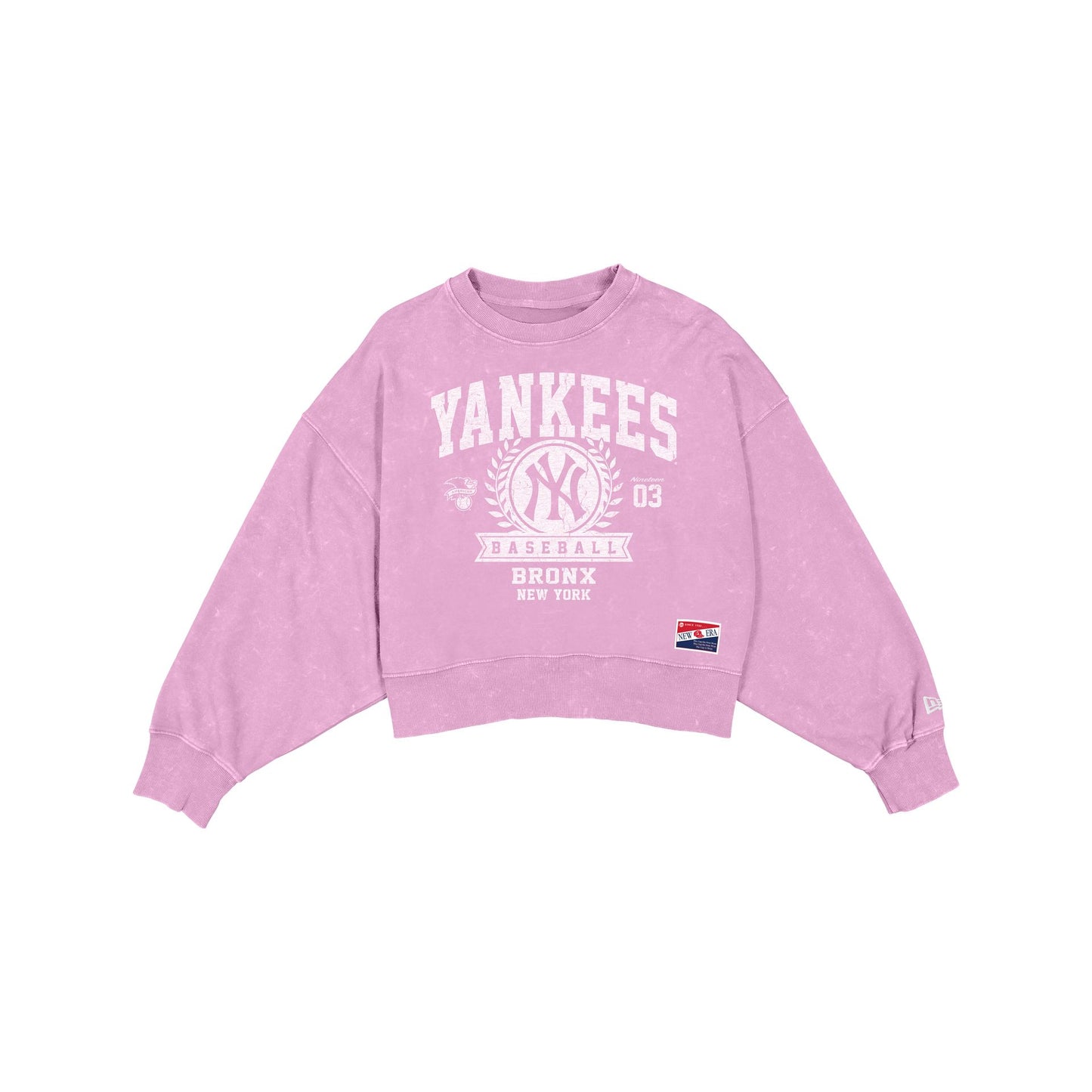 The New York Yankees Throwback Women's Boxy Pink Crewneck features a screen-printed Yankees graphic at the front with a New Era jock tag at the left hip.