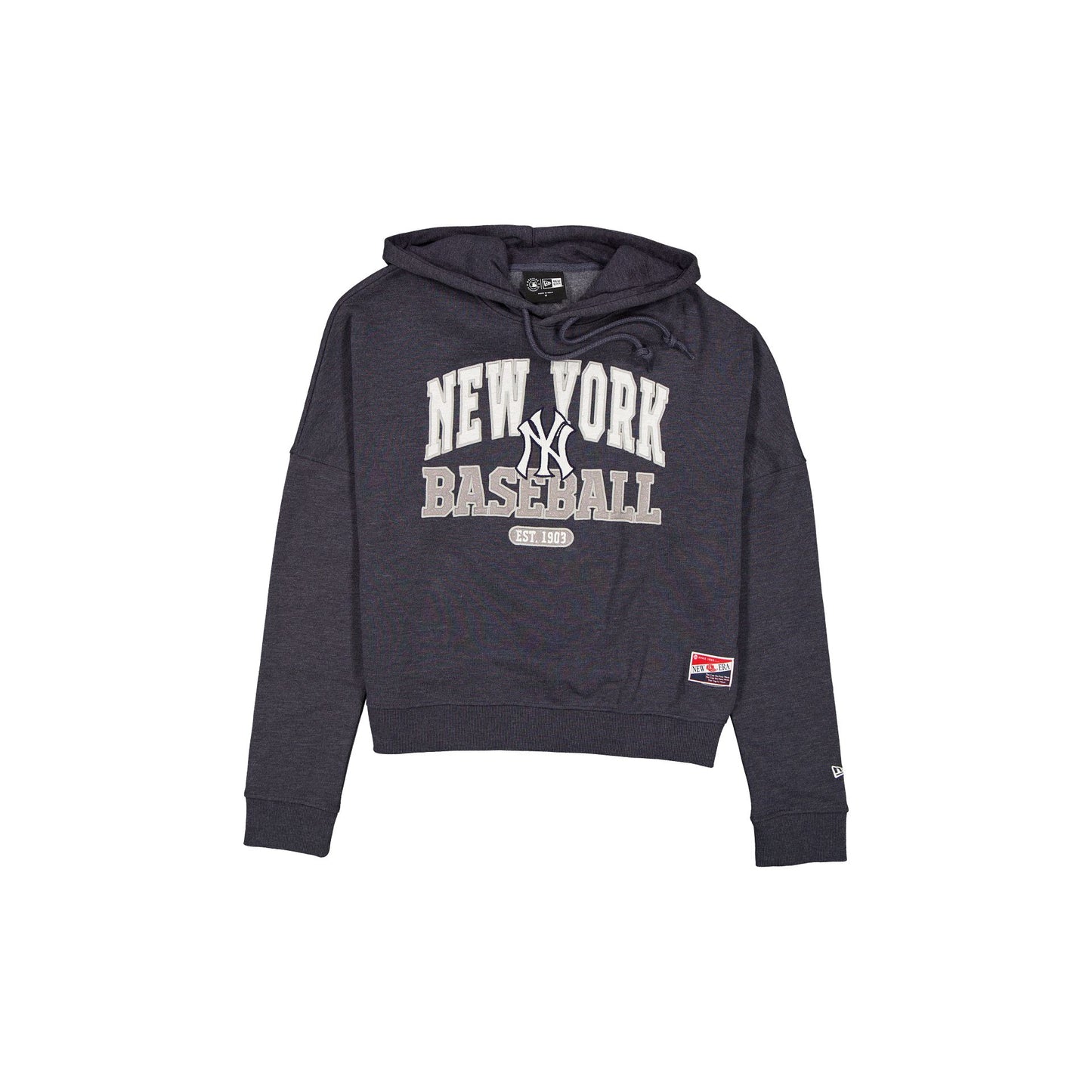The New York Yankees Throwback Women's Glitter Hoodie features an embroidered Yankees glitter applique wordmark and logo at the front with adjustable drawstrings at the hood.