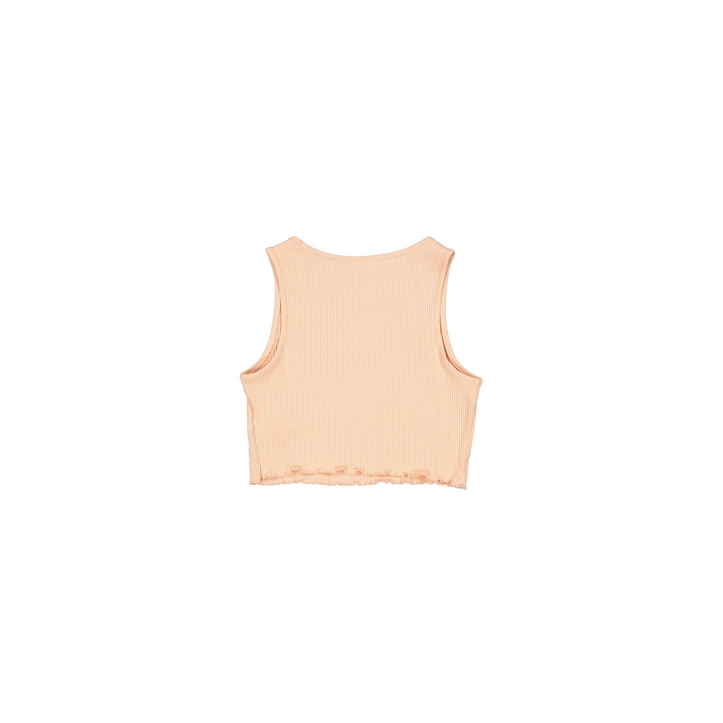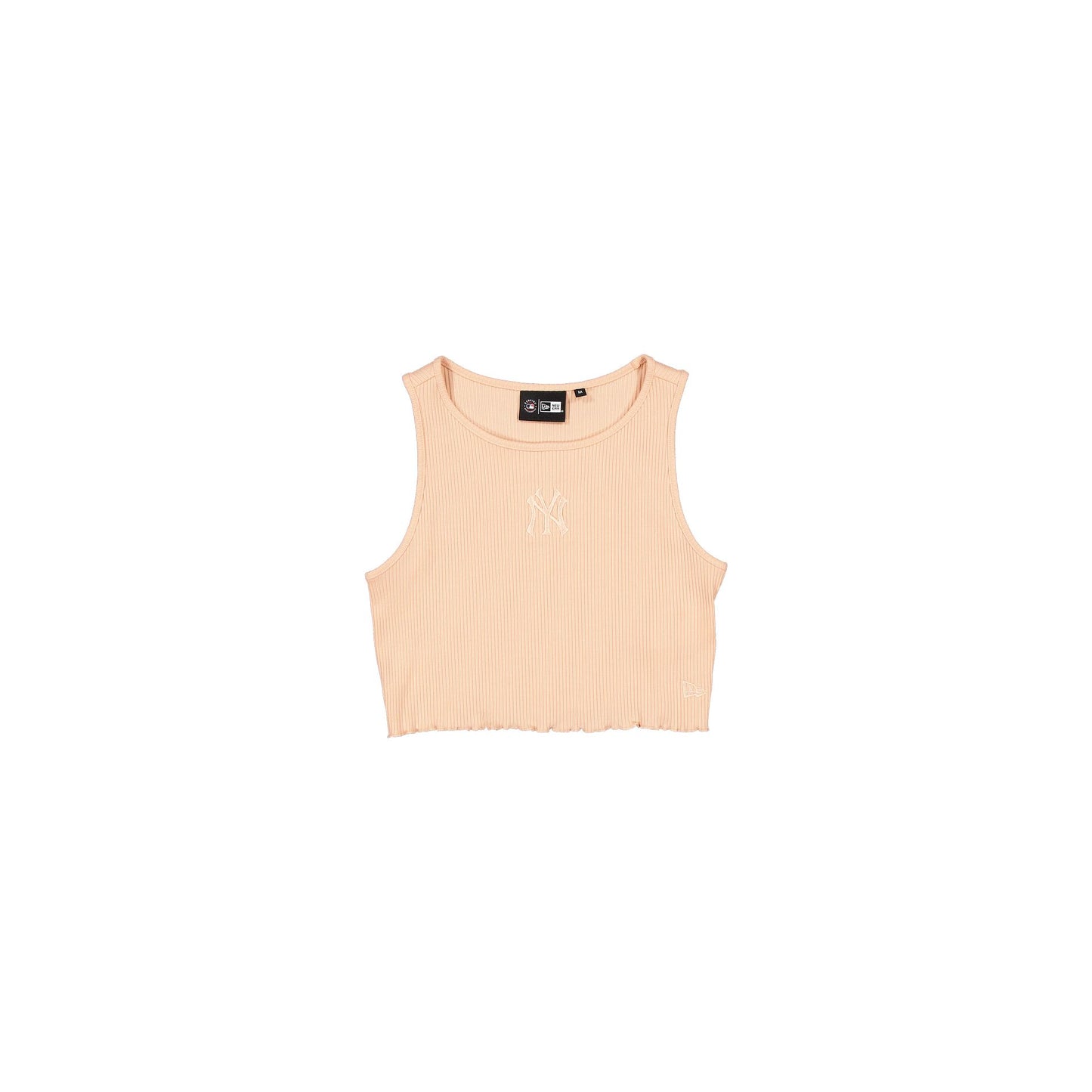 The New York Yankees Tonel Cropped Rib Pastel Pink Women's Tank Top features a monochromatic embroidered Yankees logo at the chest with a New Era Flag at the lettuce hem.