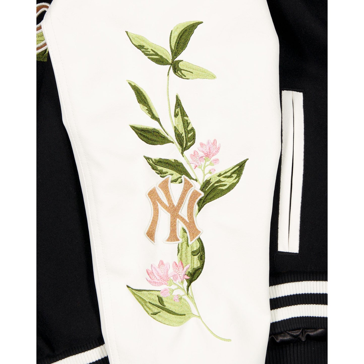 The New York Yankees Women's Black Floral Varsity Jacket features an embroidered twill applique Yankees logo at the left chest with a matching logo at the right arm. Additional details include a twill applique satin stitched team wordmark a the rear with floral embroidery throughout.