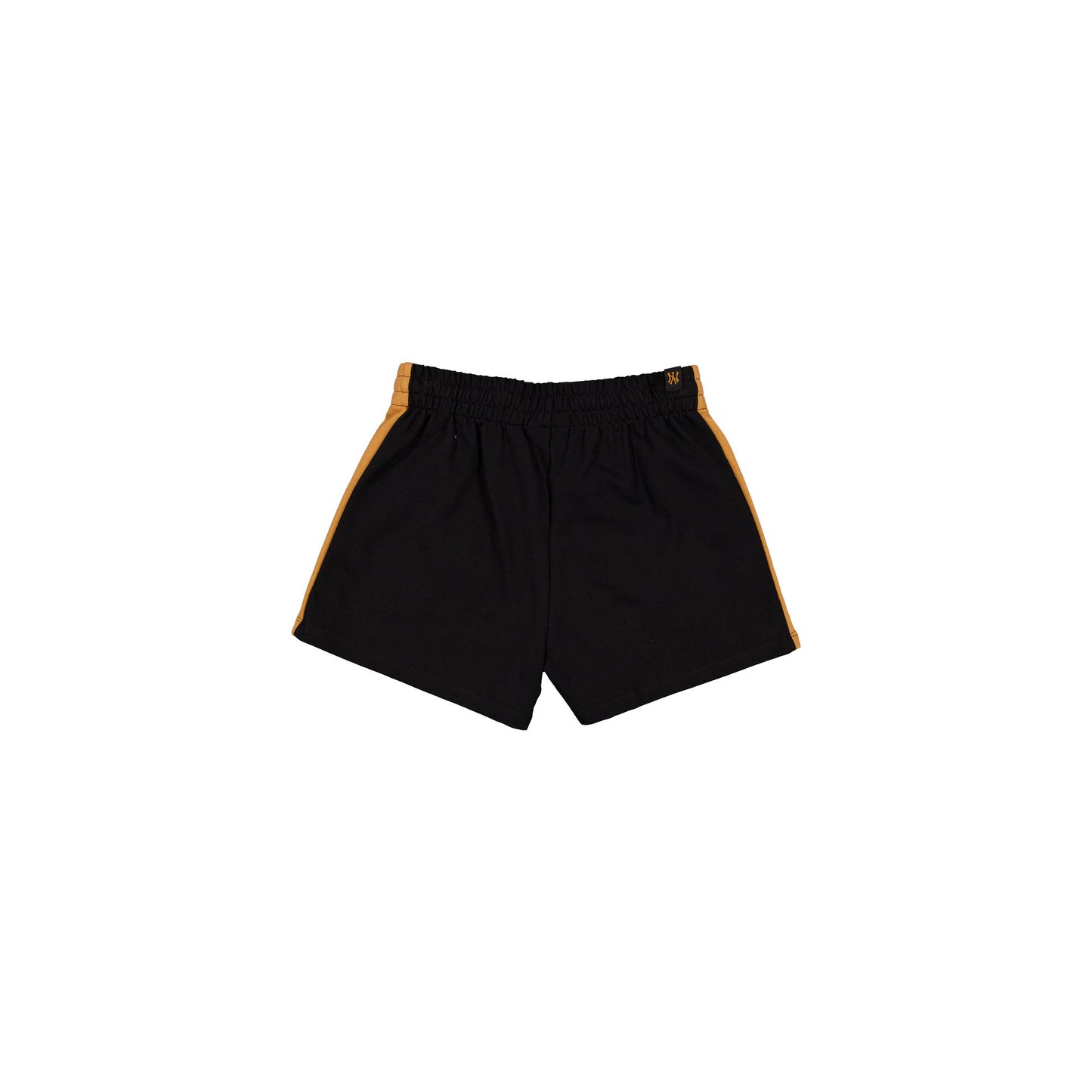 The New York Yankees Women's High Waisted Black Floral Shorts feature an embroidered Yankees floral logo at the right leg with pockets and adjustable drawstrings.