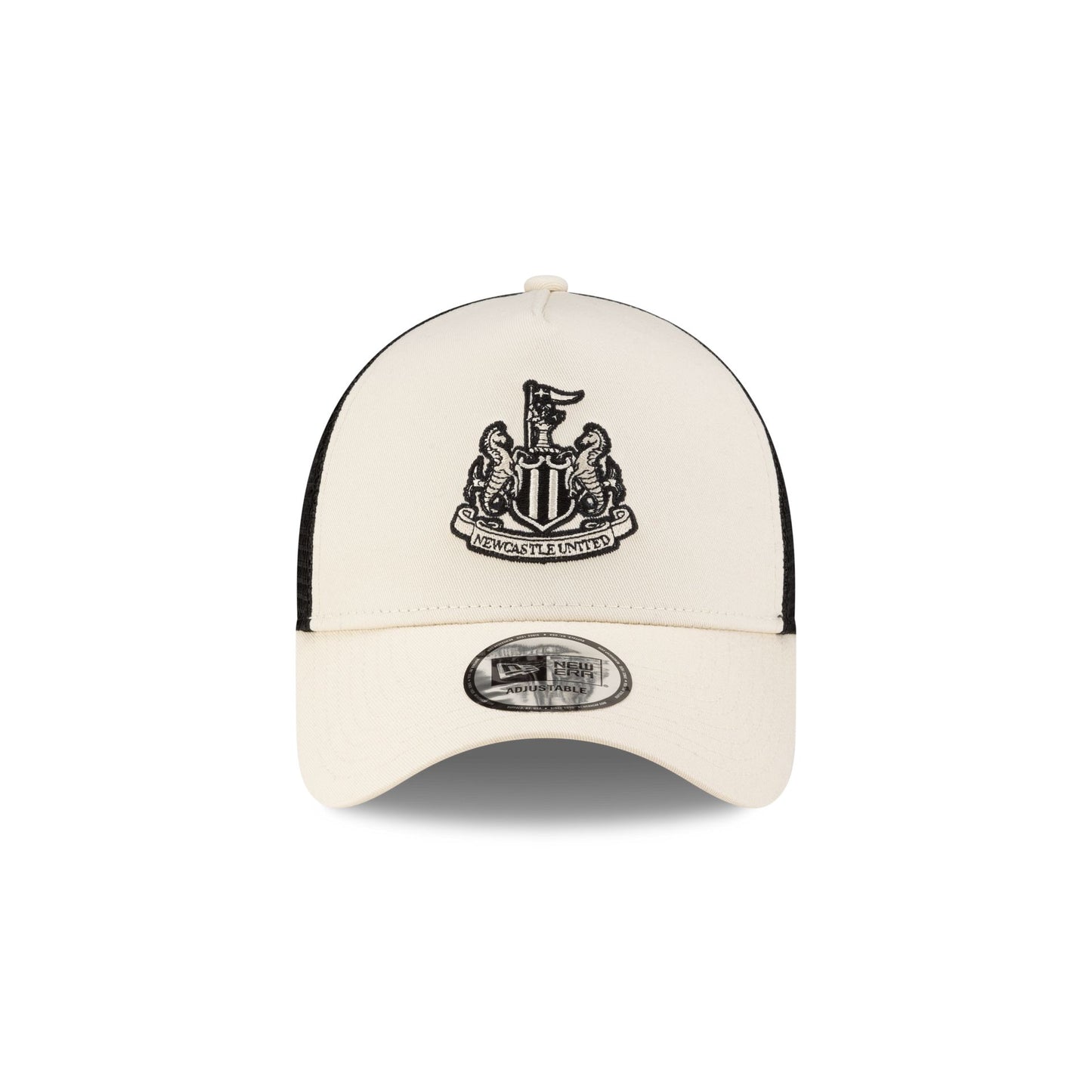 The Newcastle United FC Light Cream 9FORTY A-Frame Trucker features an embroidered Newcastle logo at the front panels with an adjustable snapback closure at a mesh rear.