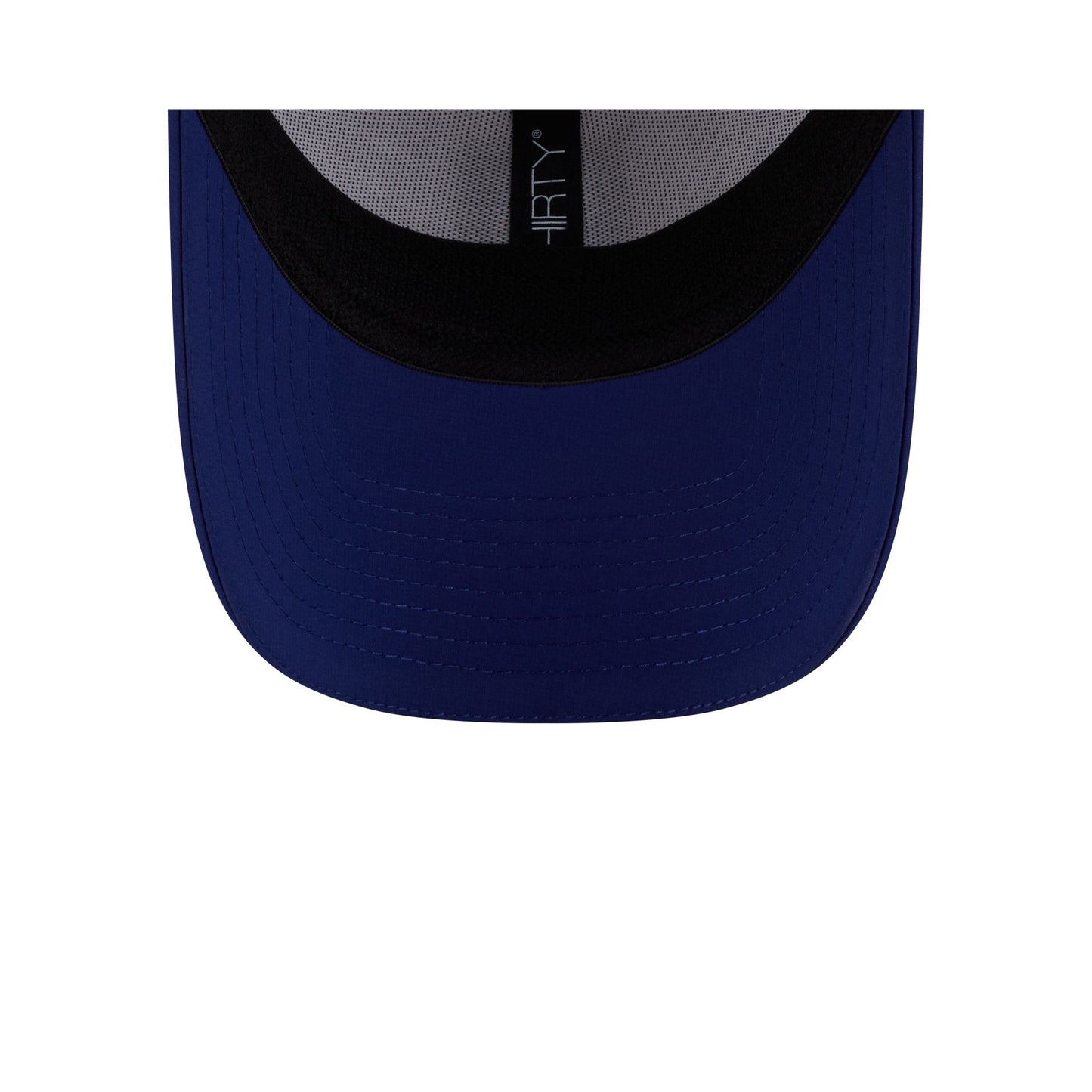 The NFL 2025 Training 39THIRTY Stretch Fit Cap features a silicone NFL Shield patch at the front panels with league color stripes at the front of a navy visor and a silicone NFL Shield patch at the rear.