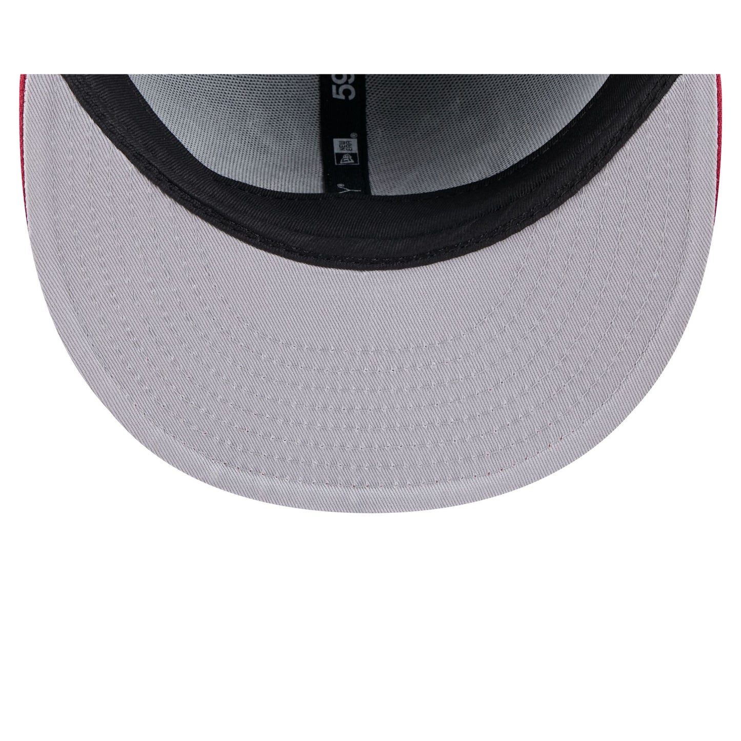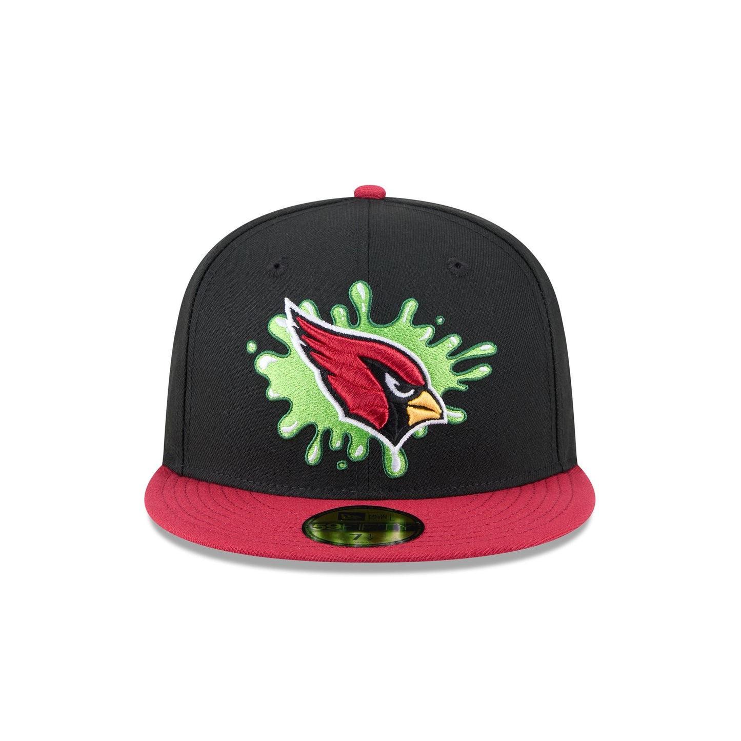 The Nickelodeon Slime x Arizona Cardinals 59FIFTY Fitted Cap features an embroidered Cardinals slime logo at the front panels with a monochromatic black logo at the rear and a gray undervisor.