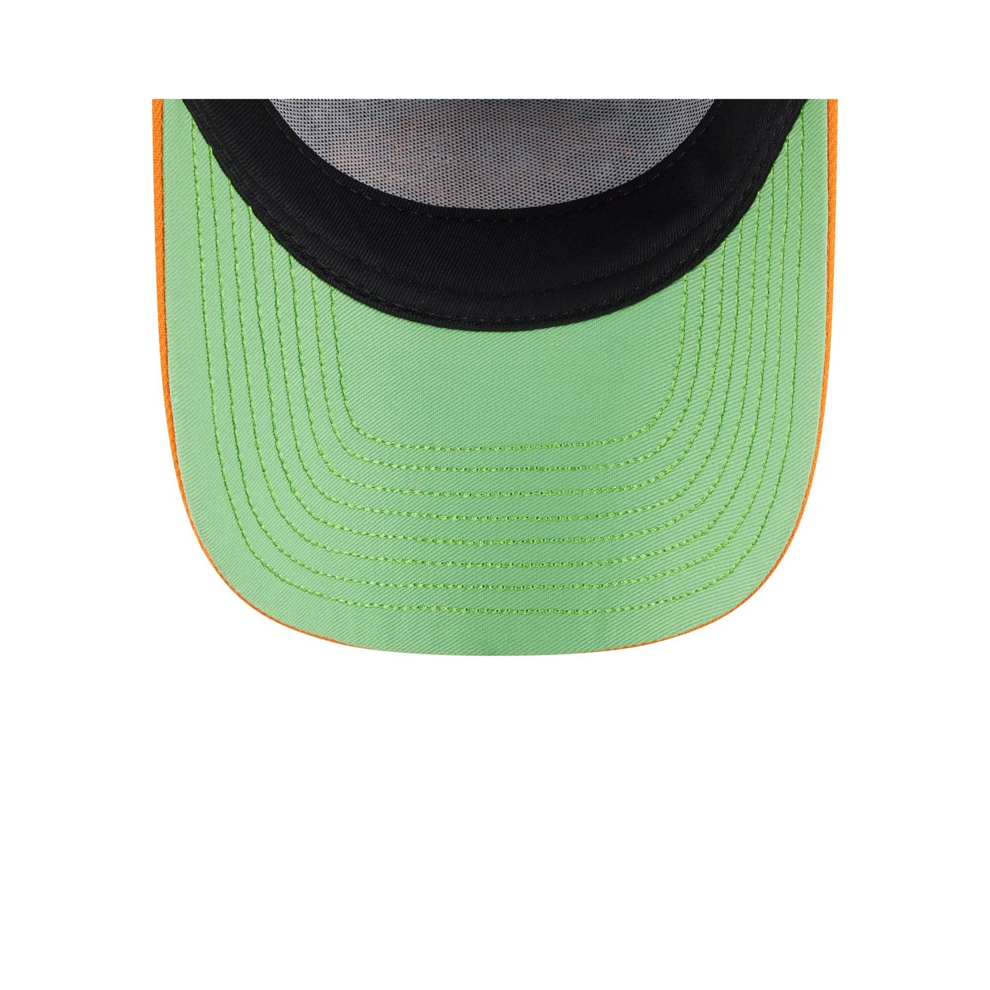 The Nickelodeon Slime x Baltimore Ravens 9FORTY A-Frame Snapback features an embroidered Ravens slime logo at the front panels with a slime splash on an orange visor. Additional details include an adjustable snapback closure at the rear and a neon green undervisor.