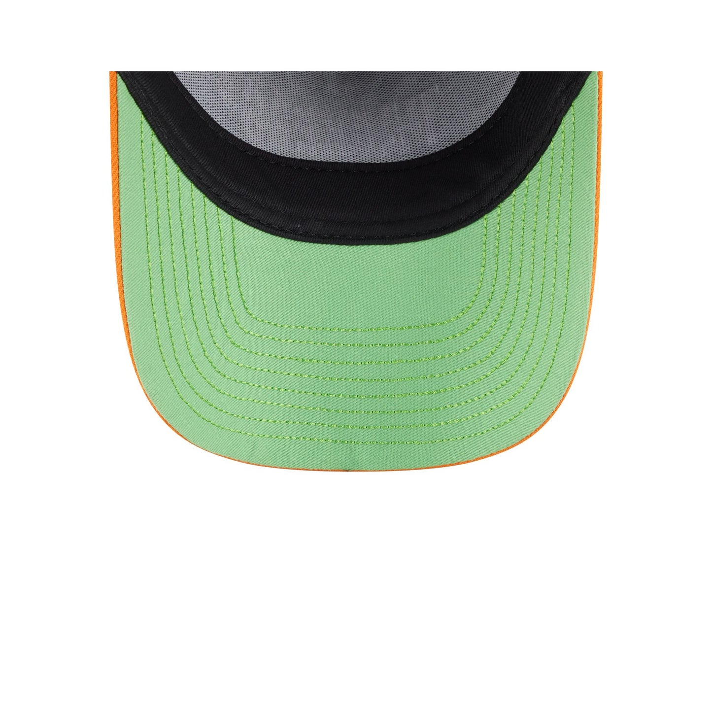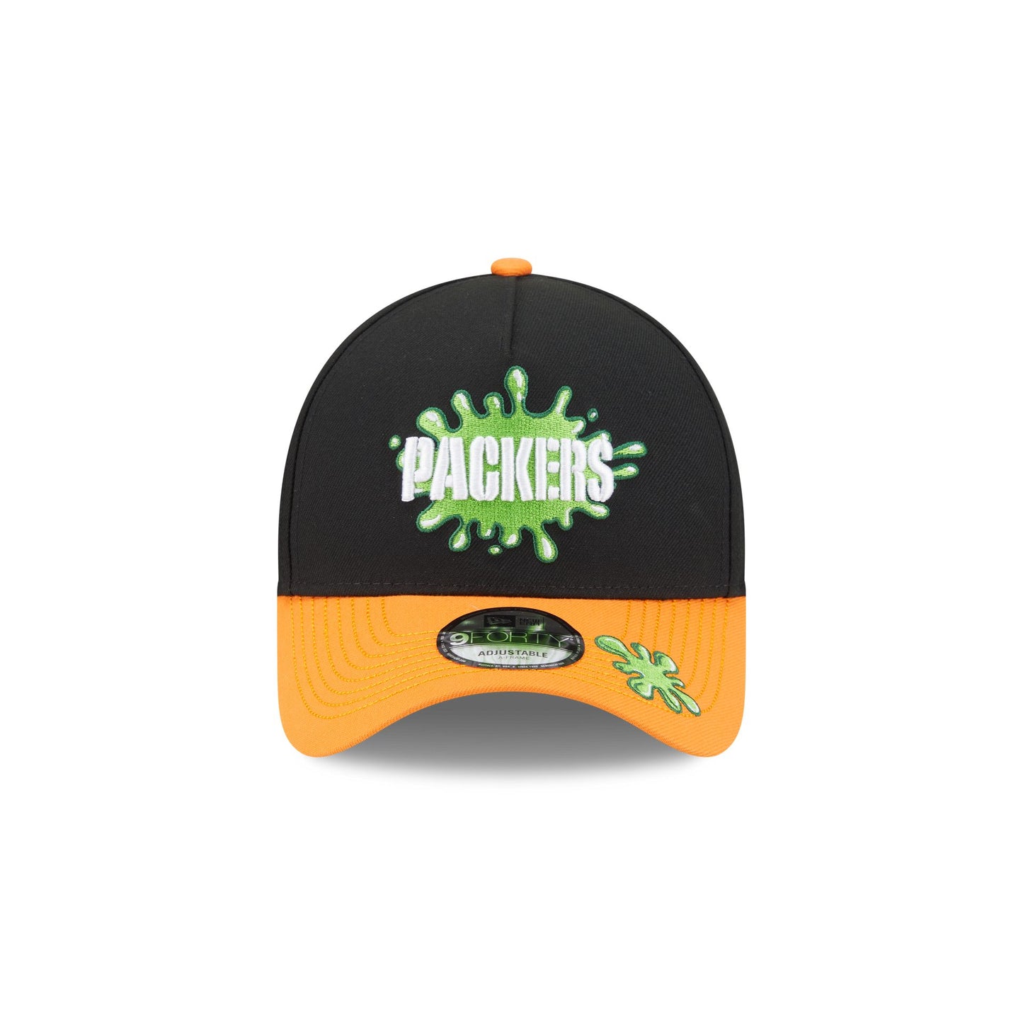 The Nickelodeon Slime x Green Bay Packers 9FORTY A-Frame Snapback features an embroidered Packers slime logo at the front panels with a slime splash on an orange visor. Additional details include an adjustable snapback closure at the rear and a neon green undervisor.