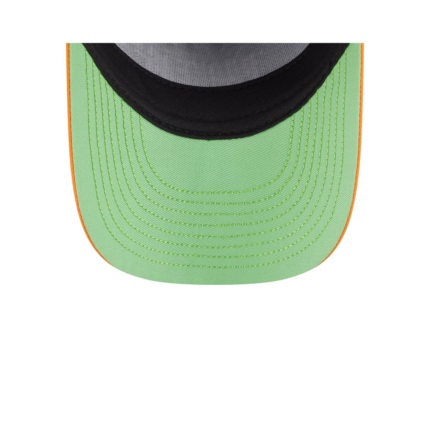 The Nickelodeon Slime x Green Bay Packers Kids 9FORTY A-Frame Snapback features an embroidered Packers slime logo at the front panels with a slime splash on an orange visor. Additional details include an adjustable snapback closure at the rear and a neon green undervisor.