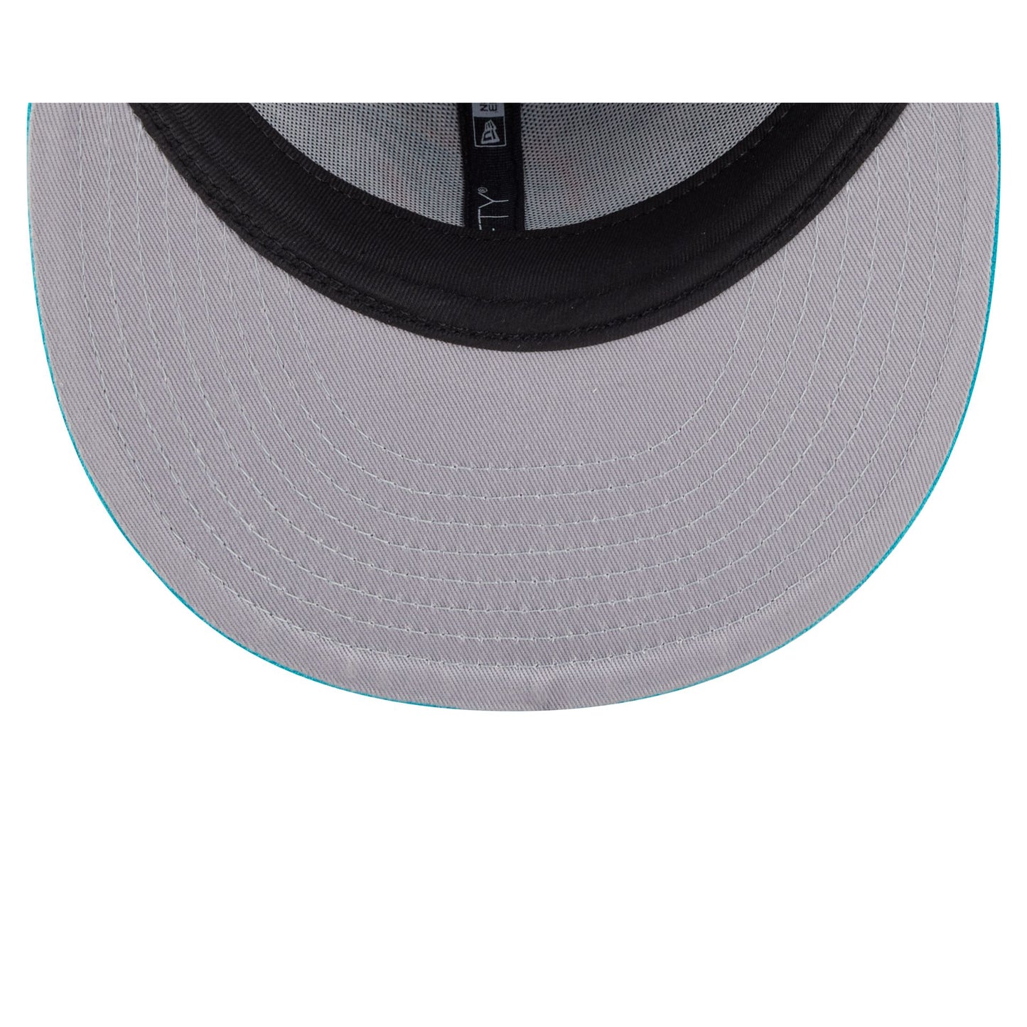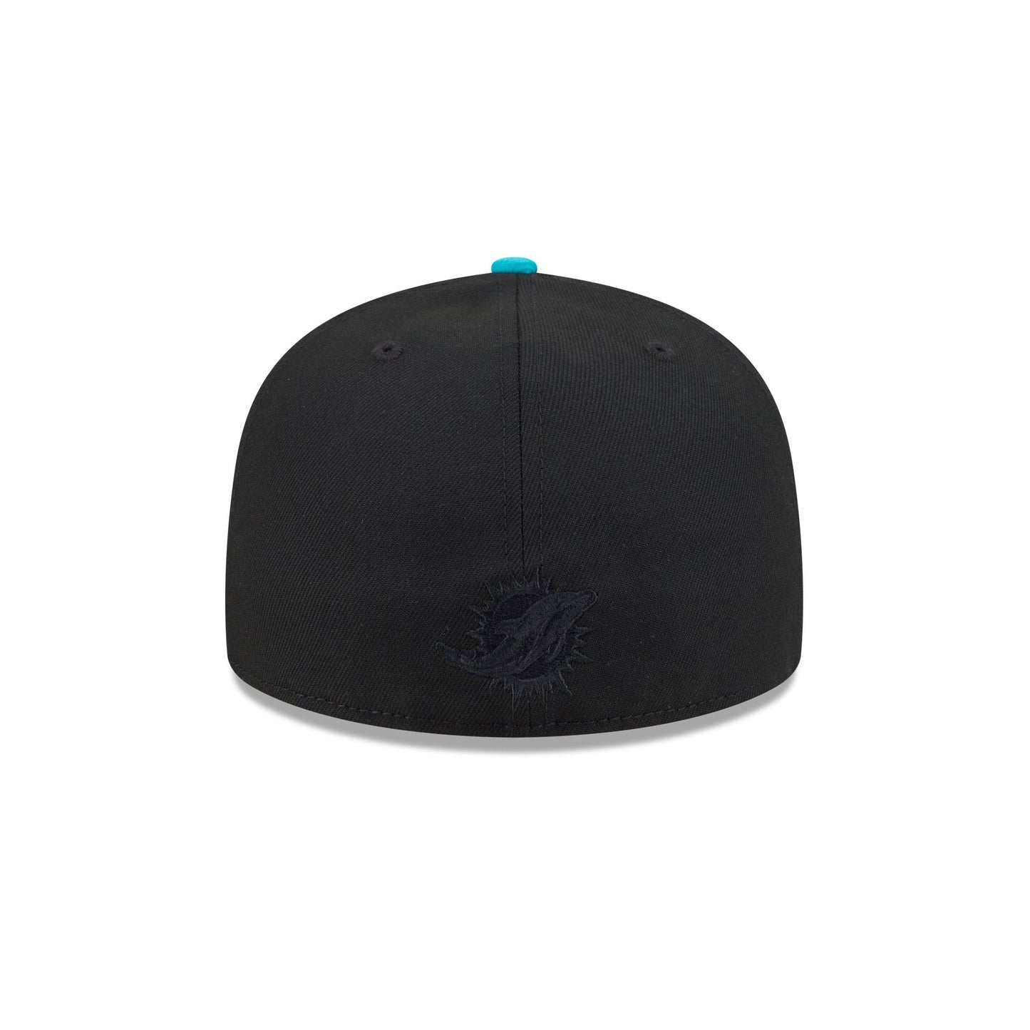 The Nickelodeon Slime x Miami Dolphins 59FIFTY Fitted Cap features an embroidered Dolphins slime logo at the front panels with a monochromatic black logo at the rear and a gray undervisor.