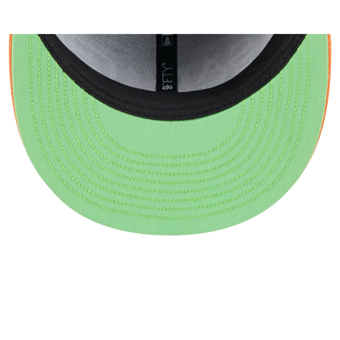 The Nickelodeon Slime x New Orleans Saints 9FIFTY Snapback features an embroidered Saints slime logo at the front panels with a slime splash on an orange visor. Additional details include an adjustable snapback closure at the rear and a neon green undervisor.