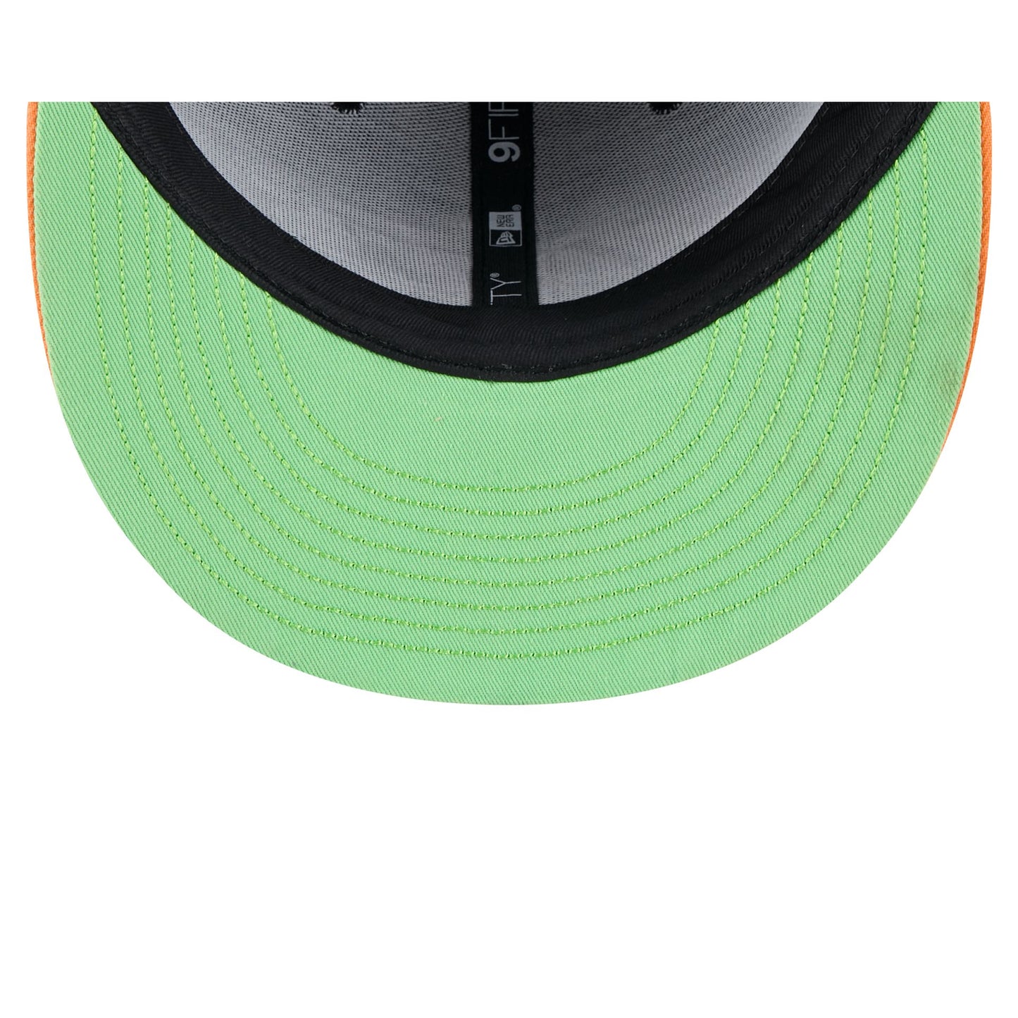 The Nickelodeon Slime x New York Jets 9FIFTY Snapback features an embroidered Jets slime logo at the front panels with a slime splash on an orange visor. Additional details include an adjustable snapback closure at the rear and a neon green undervisor.