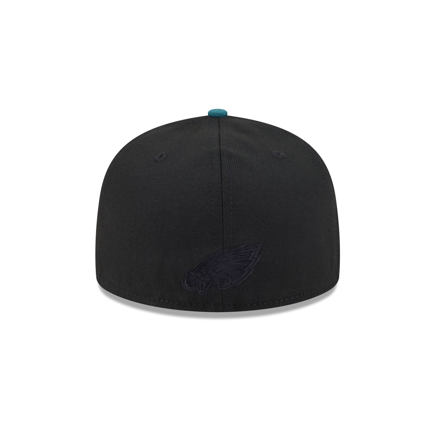 The Nickelodeon Slime x Philadelphia Eagles 59FIFTY Fitted Cap features an embroidered Eagles slime logo at the front panels with a monochromatic black logo at the rear and a gray undervisor.