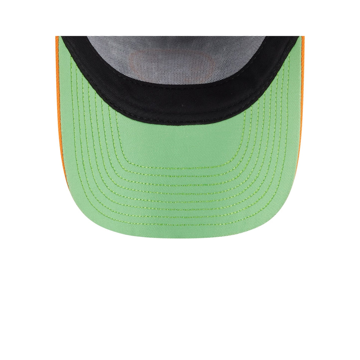 The Nickelodeon Slime x San Francisco 49ers 9FORTY A-Frame Snapback features an embroidered 49ers slime logo at the front panels with a slime splash on an orange visor. Additional details include an adjustable snapback closure at the rear and a neon green undervisor.