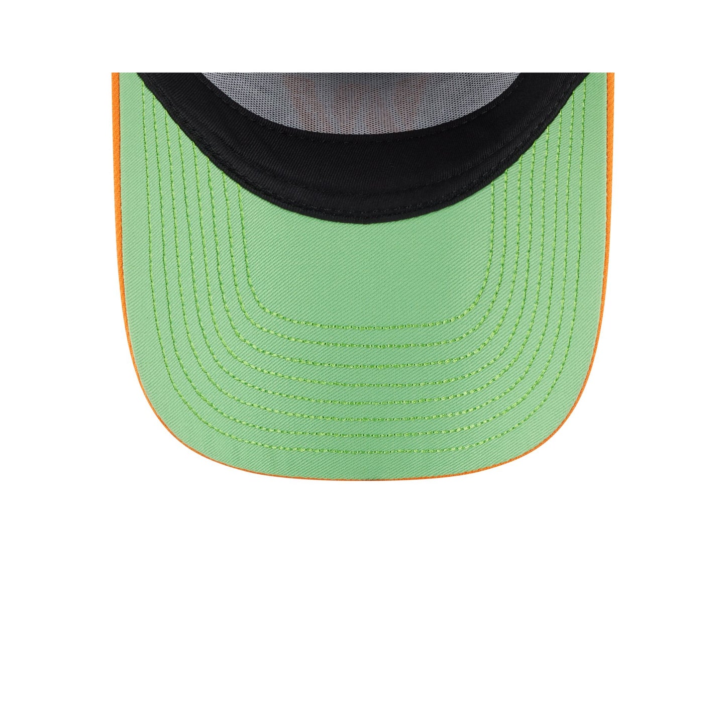 The Nickelodeon Slime x Washington Commanders 9FORTY A-Frame Snapback features an embroidered Commanders slime logo at the front panels with a slime splash on an orange visor. Additional details include an adjustable snapback closure at the rear and a neon green undervisor.