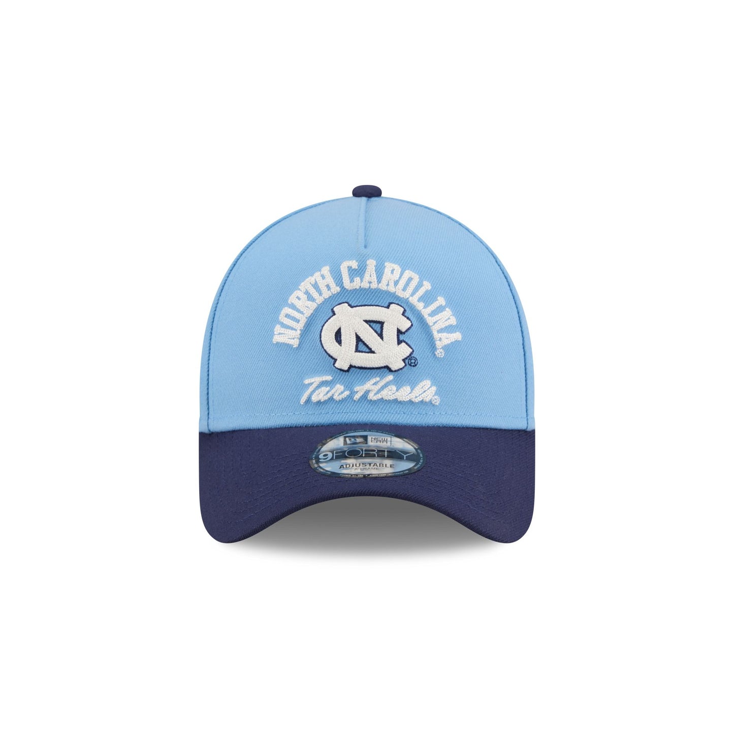 The North Carolina Tar Heels Arched 9FORTY A-Frame Snapback features an embroidered Tar Heels arched logo graphic at the front panels with a team graphic at the right-wear side. Additional details include the establishment date above an adjustable snapback closure at the rear and a gray undervisor.