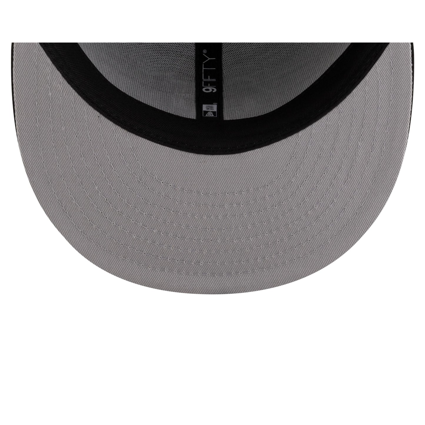 The North Carolina Tar Heels Black & White 9FIFTY Snapback features an embroidered Tar Heels logo at the front panels with a logo at the right-wear side and a snapback closure at the rear.