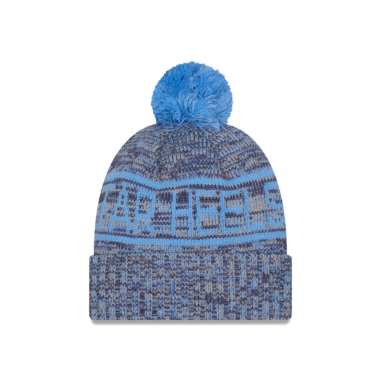 The North Carolina Tar Heels Cold Weather Pom Knit features a sewn-down silicone Tar Heels logo patch at the front cuff with a New Era Flag at the left-wear side. Additional details include a team wordmark across the crown, a one-time removeable pom, and a fleece lining.
