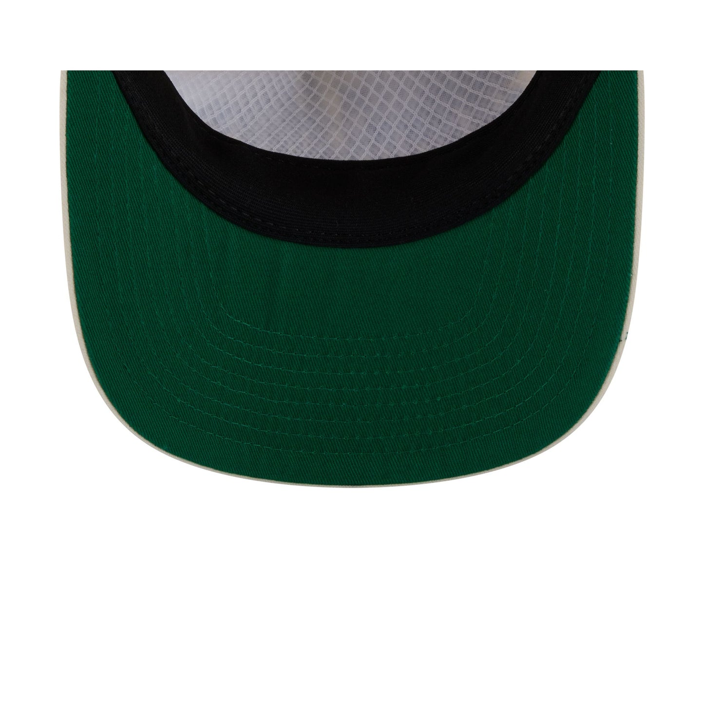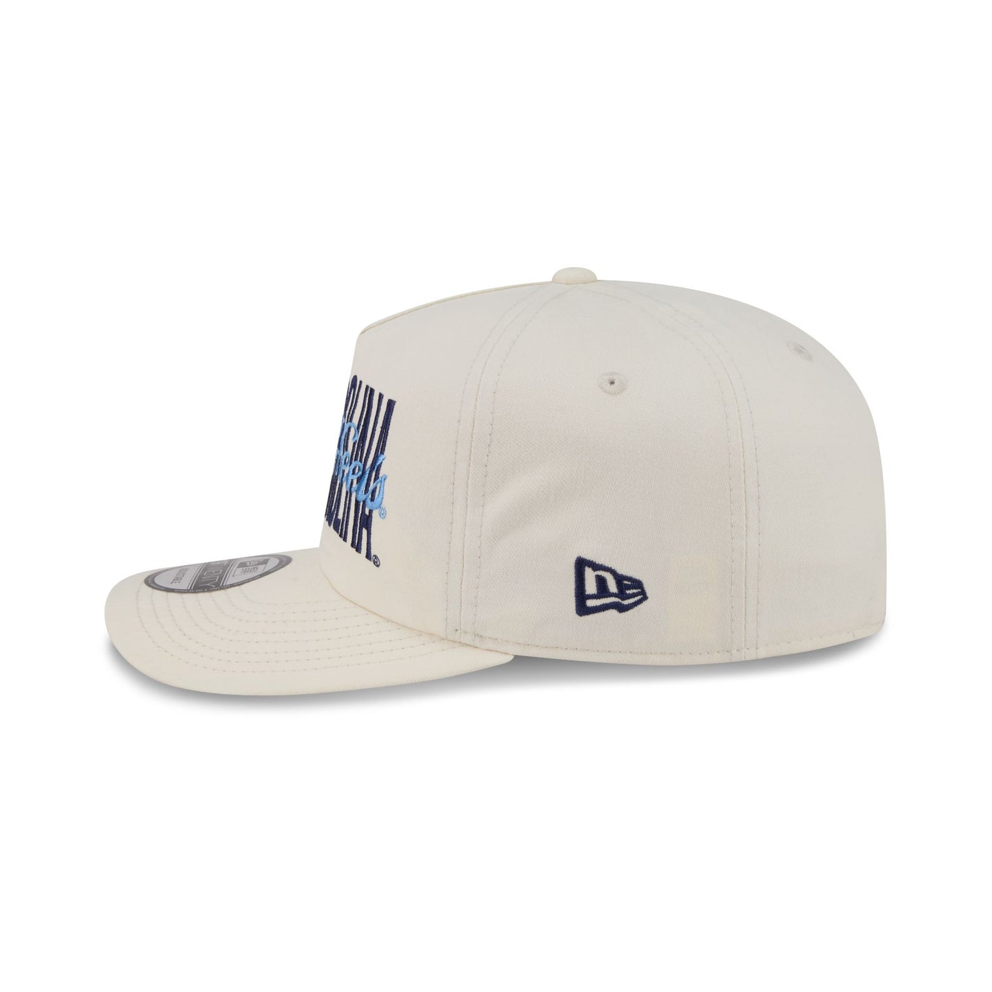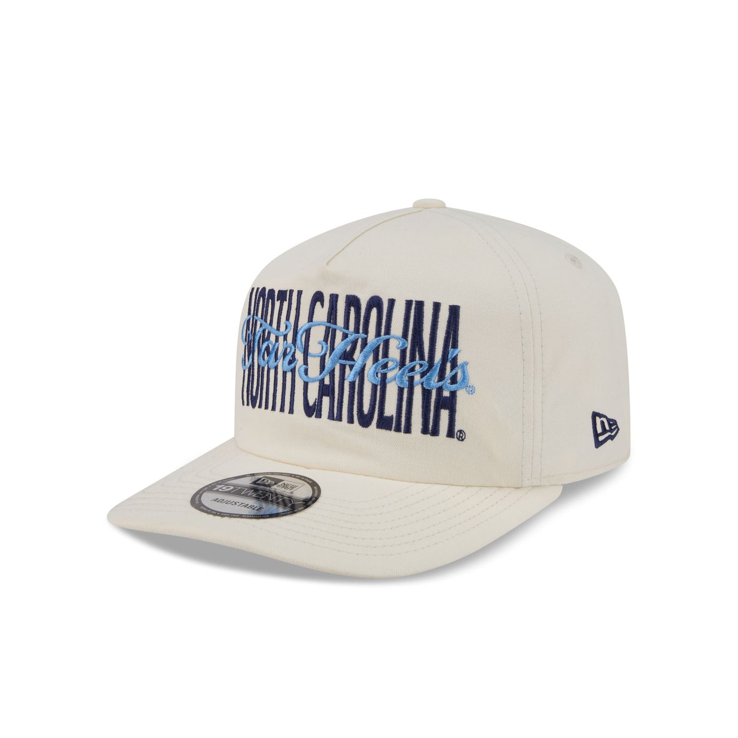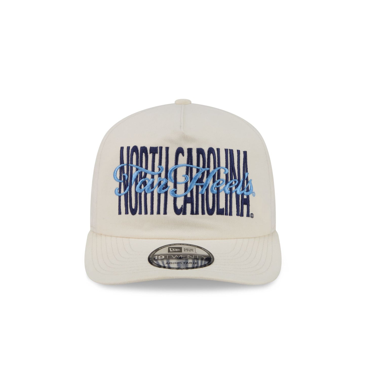 The North Carolina Tar Heels Collegiate Script Ivory Pre-Curved 19TWENTY Snapback features an embroidered Tar Heels wordmark and script at the front panel with a team logo at the right-wear side, a green undervisor, and an adjustable snapback closure at the rear.