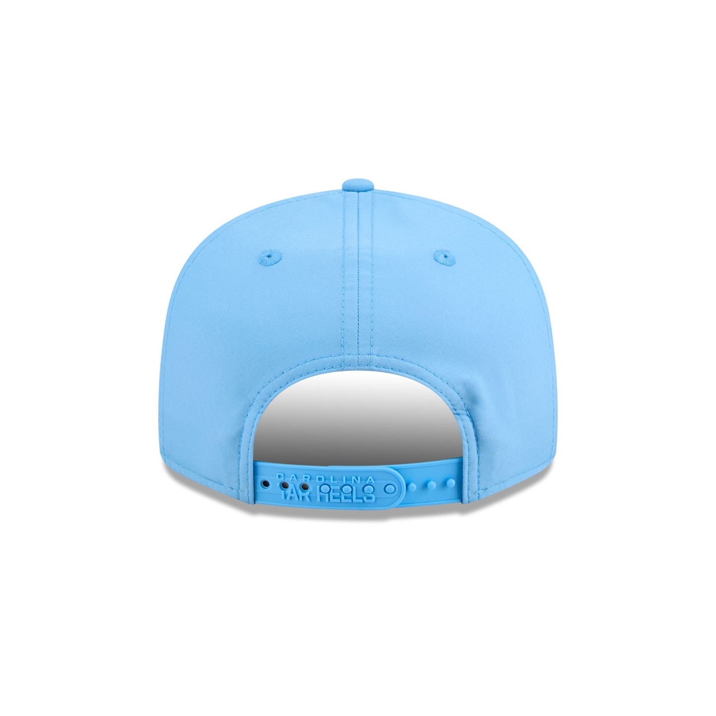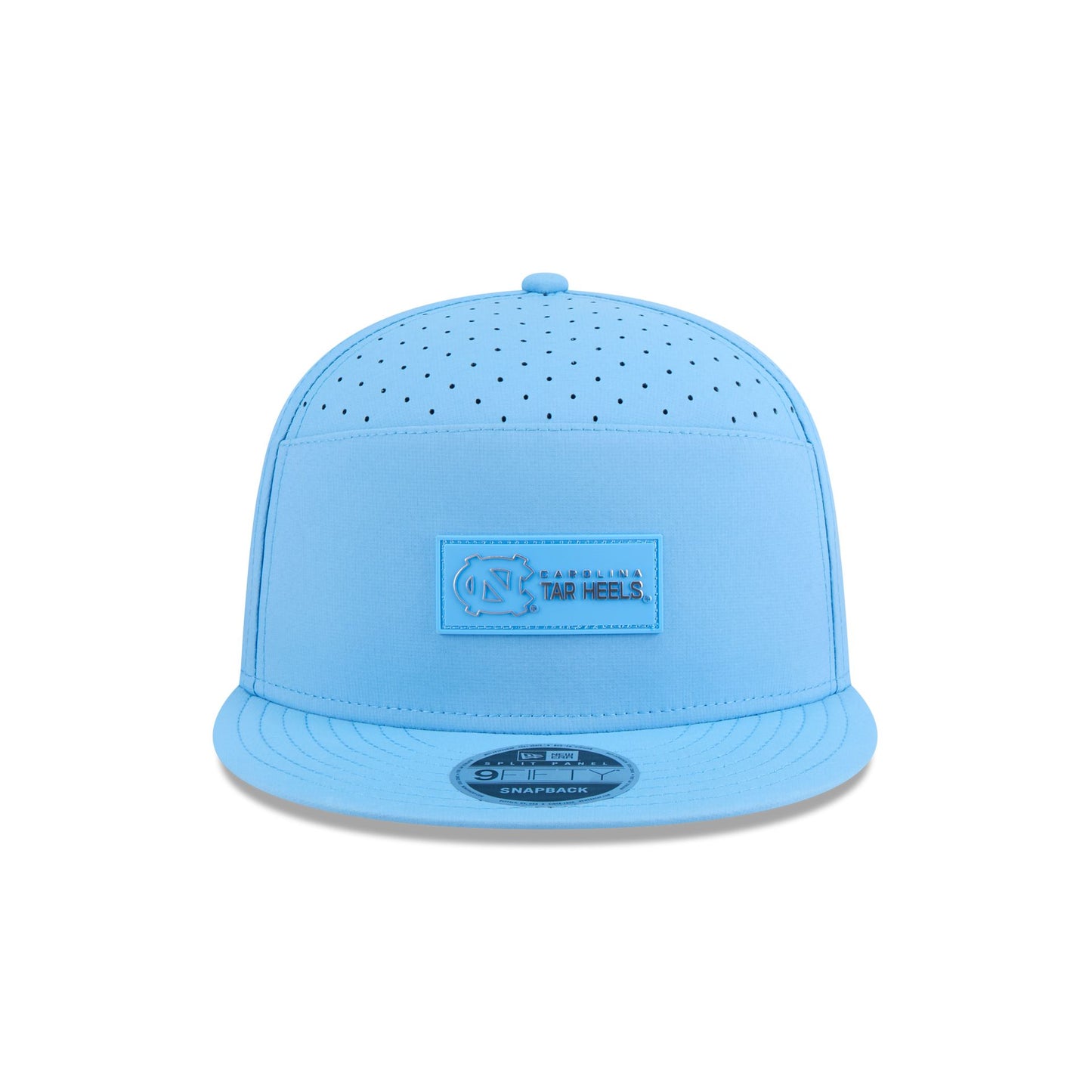 The North Carolina Tar Heels Hot Weather Split Panel 9FIFTY Snapback features a sewn-down silicone Tar Heels logo patch at the front panels with a split-crown construction featuring water-repellent quill tech fabrication. Additional details include a team wordmark at a soft silicone snapback closure at the rear with a quick-dry cushioned sweatband to absorb moisture and team color silicone transfer details at the undervisor.