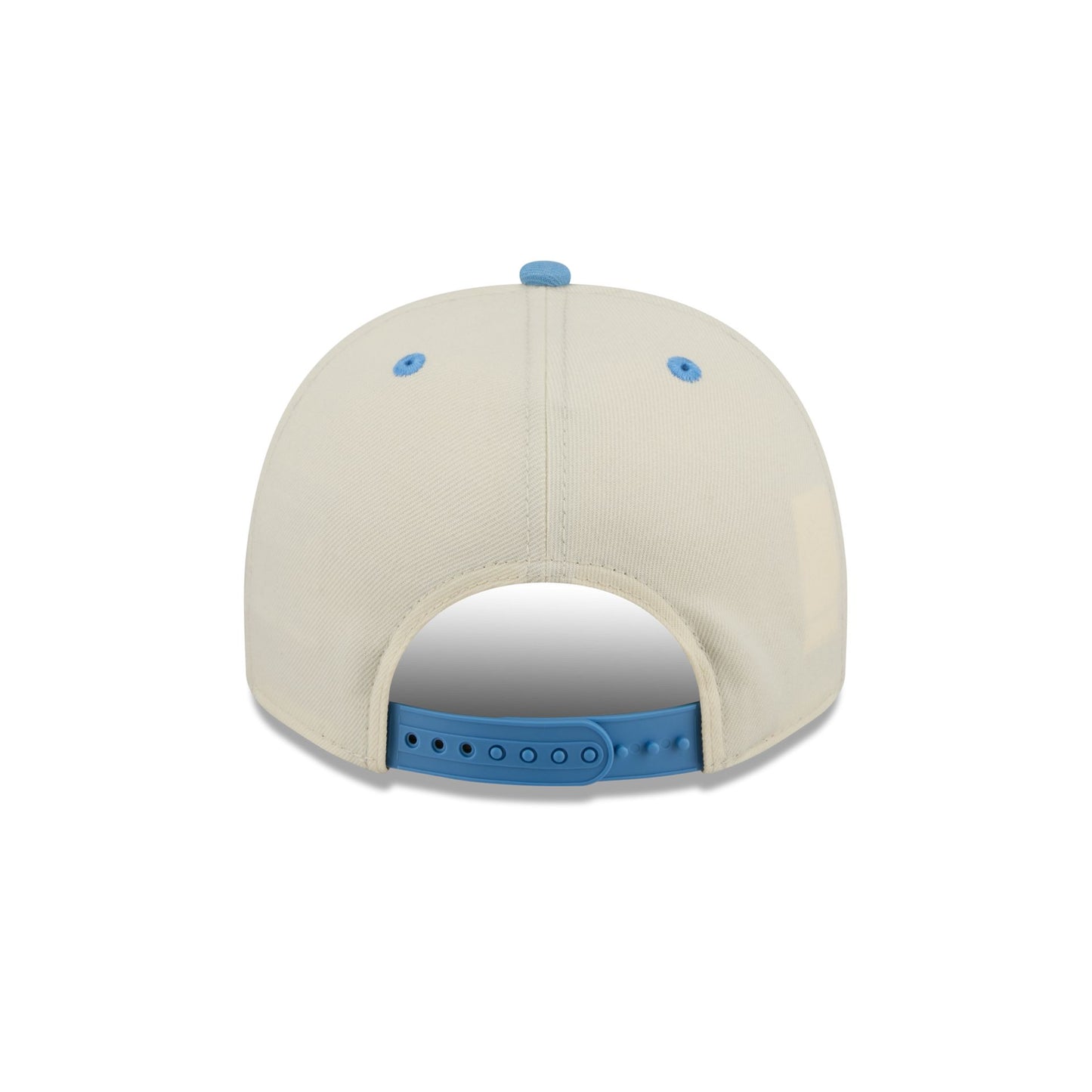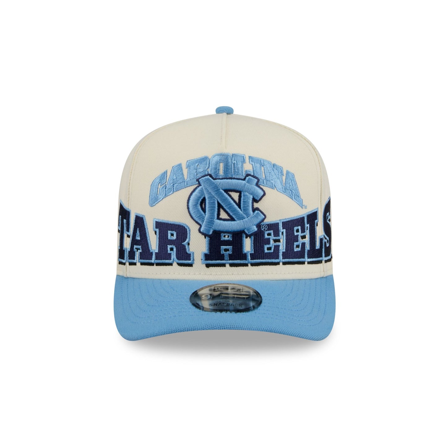 The North Carolina Tar Heels March Madness Chrome 9FIFTY A-Frame Snapback features an embroidered Tar Heels logo and wordmark across the front panel with an adjustable snapback closure at the rear, a blue visor, and a green undervisor.
